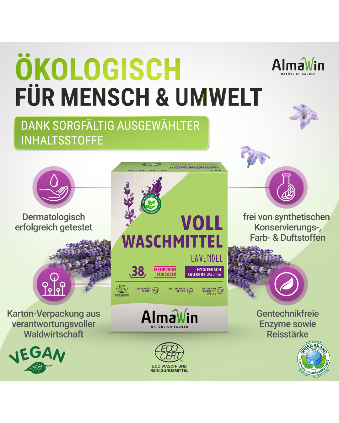 Das Produkt ist durch ECOCERT zertifiziert und wird in umweltfreundlichem Graskarton geliefert. Der innenliegende Beutel besteht aus recyclebarer Plastikfolie. Mit über 97 % natürlichen Inhaltsstoffen setzt das AlmaWin Vollwaschmittel auf Nachhaltigkeit. Es enthält keine Phosphate, Chlor oder optischen Aufheller und ist damit schonend zu Umwelt und Haut. Zudem ist es vegan und frei von tierischen Inhaltsstoffen.