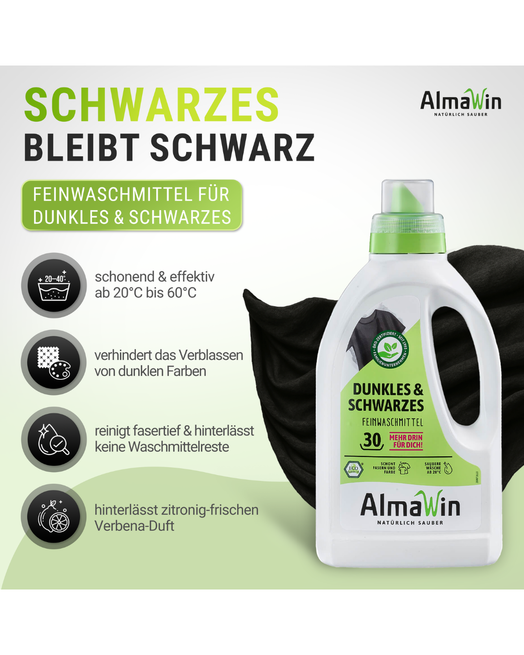 AlmaWin Dunkles & Schwarzes Feinwaschmittel sorgt dafür, dass deine dunklen und schwarzen Textilien lange wie neu aussehen. Die spezielle Rezeptur mit Waschnussextrakt reinigt intensiv und schonend, während die Farben lebendig bleiben und das Verblassen vermieden wird. Durch den frischen Duft von Eisenkraut-Limone und Eukalyptus wird deine Wäsche angenehm duften – ganz ohne synthetische Duftstoffe oder andere künstliche Zusätze.