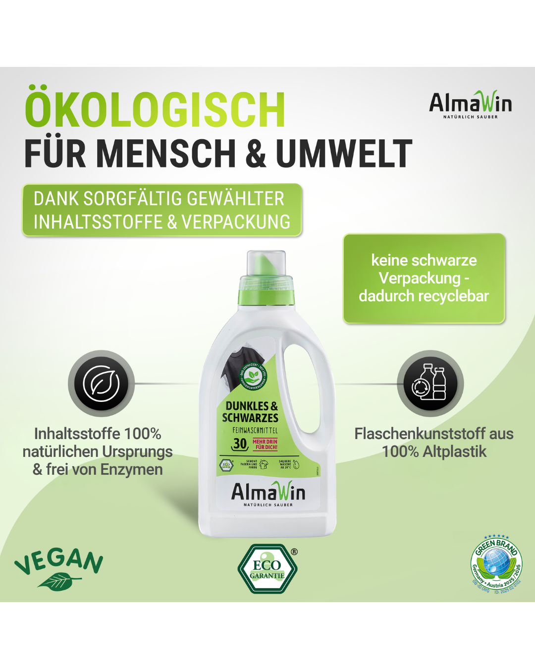 Bei greenist setzen wir auf Transparenz, Natürlichkeit und Nachhaltigkeit. AlmaWin Dunkles & Schwarzes Feinwaschmittel entspricht unseren strengen Richtlinien, da es: