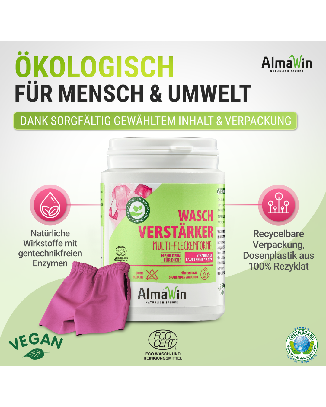 Hergestellt in Deutschland von AlmaWin, steht der Waschverstärker für nachhaltige Produktion, ökologische Inhaltsstoffe und verantwortungsvolle Herstellung. Allergische Reaktionen sind möglich, daher sollten die Anwendungshinweise beachtet werden.