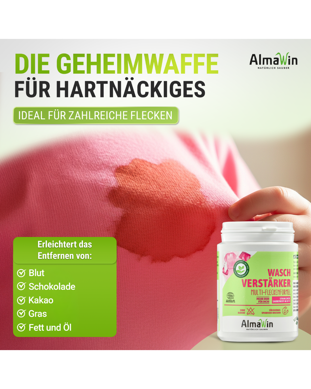 Der Waschverstärker Multi-Fleckenformel von AlmaWin ergänzt die gewohnte Wäschepflege und sorgt für effektive Fleckenentfernung. Er ist ideal für stark verschmutzte Textilien und unterstützt die Reinigung, ohne die Umwelt unnötig zu belasten.