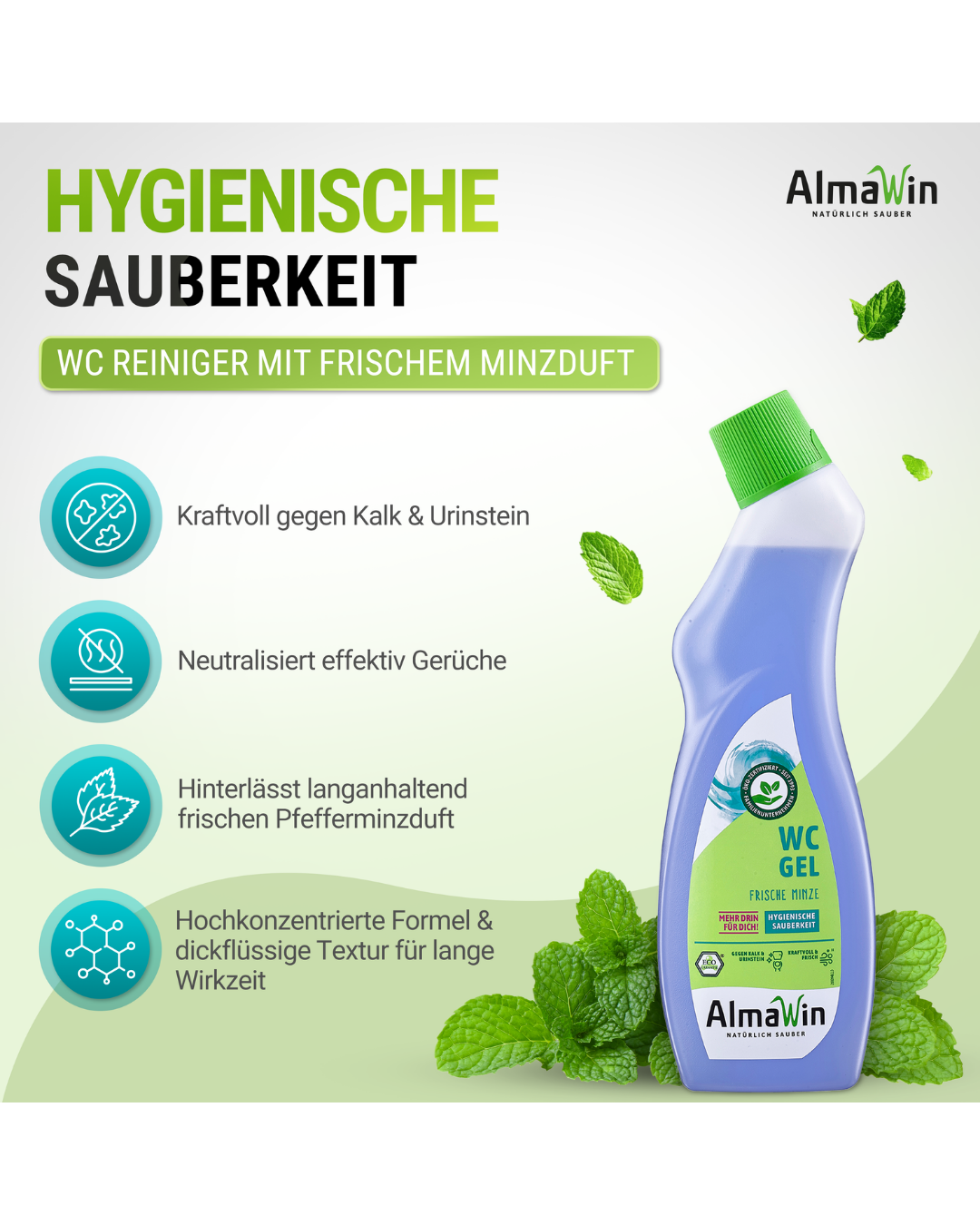 Bei greenist setzen wir auf Produkte, die sowohl umweltfreundlich als auch vegan sind. AlmaWin erfüllt diese Kriterien mit seinem WC Gel auf vorbildliche Weise. Das Produkt ist nicht nur vegan, sondern auch dermatologisch getestet und umweltfreundlich verpackt. Mit AlmaWin bieten wir dir eine effektive und verantwortungsvolle Reinigungslösung, die unseren hohen Standards für Natürlichkeit und Nachhaltigkeit entspricht. Das AlmaWin WC Gel Frische Minze verbindet effektive Reinigungskraft mit einer veganen und umweltbewussten Formulierung. Ideal für eine gründliche Reinigung, ganz ohne tierische Inhaltsstoffe.