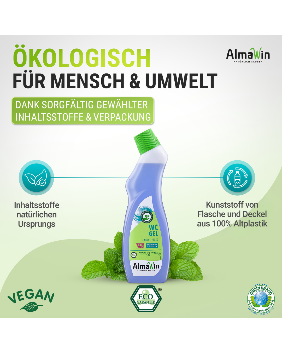 Die Rezeptur des AlmaWin WC Gels besteht aus rein natürlichen Inhaltsstoffen, darunter ätherisches Pfefferminzöl für einen frischen Duft. Auf synthetische Duft- oder Farbstoffe wird bewusst verzichtet. Die Flasche besteht aus 100 % recyceltem Altplastik und ist vollständig recyclebar. Das Etikett besteht aus recyclebaren Materialien und ist mit mineralölfreien Farben bedruckt. Das Produkt ist vegan und ökozertifiziert durch Ecogarantie, was die hohen Umweltstandards des Herstellers unterstreicht.