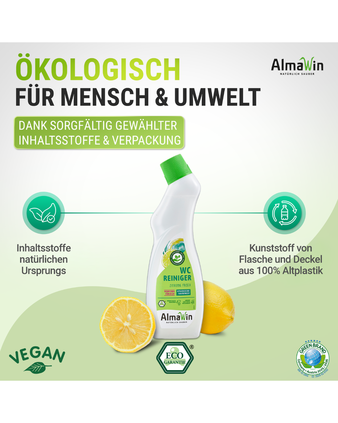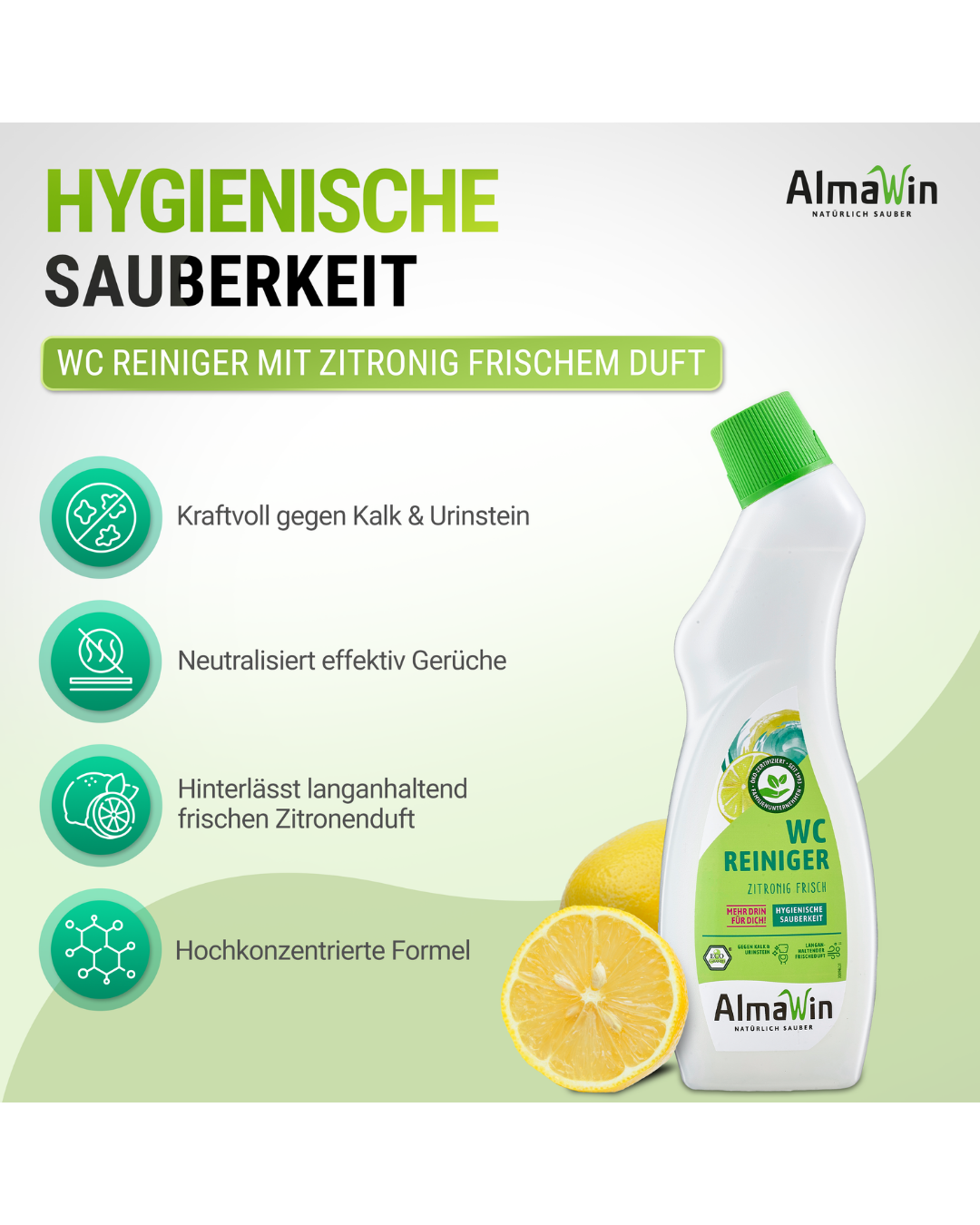 Der AlmaWin WC Reiniger Zitronig Frisch erfüllt diese Prinzipien und bietet eine umweltfreundliche und ethisch vertretbare Lösung für die Reinigung deiner Toilette.