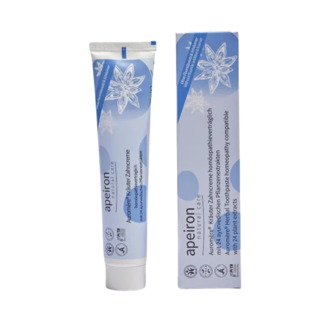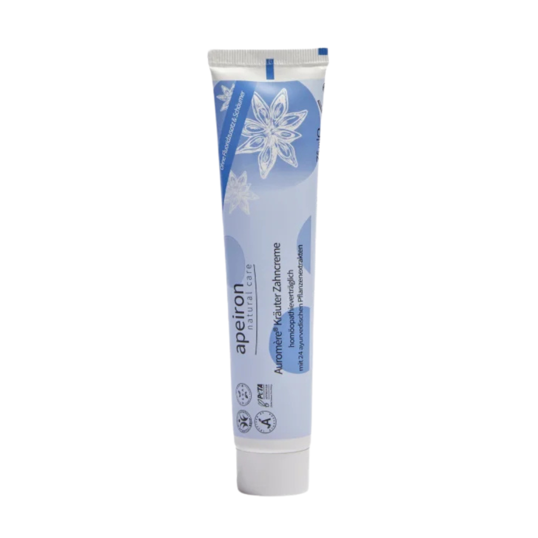 Die Apeiron Auromère Kräuter-Zahncreme bietet eine ganzheitliche Lösung für die tägliche Mundpflege – ganz ohne künstliche Zusätze. Diese spezielle Zahncreme basiert auf der Kraft von 24 ayurvedischen Pflanzenextrakten, die für ihre natürlichen Reinigungs- und pflegenden Eigenschaften bekannt sind. Sie kommt ohne Fluorid, Tenside und schäumende Füllstoffe aus und ist daher besonders sanft zu Zähnen und Zahnfleisch.