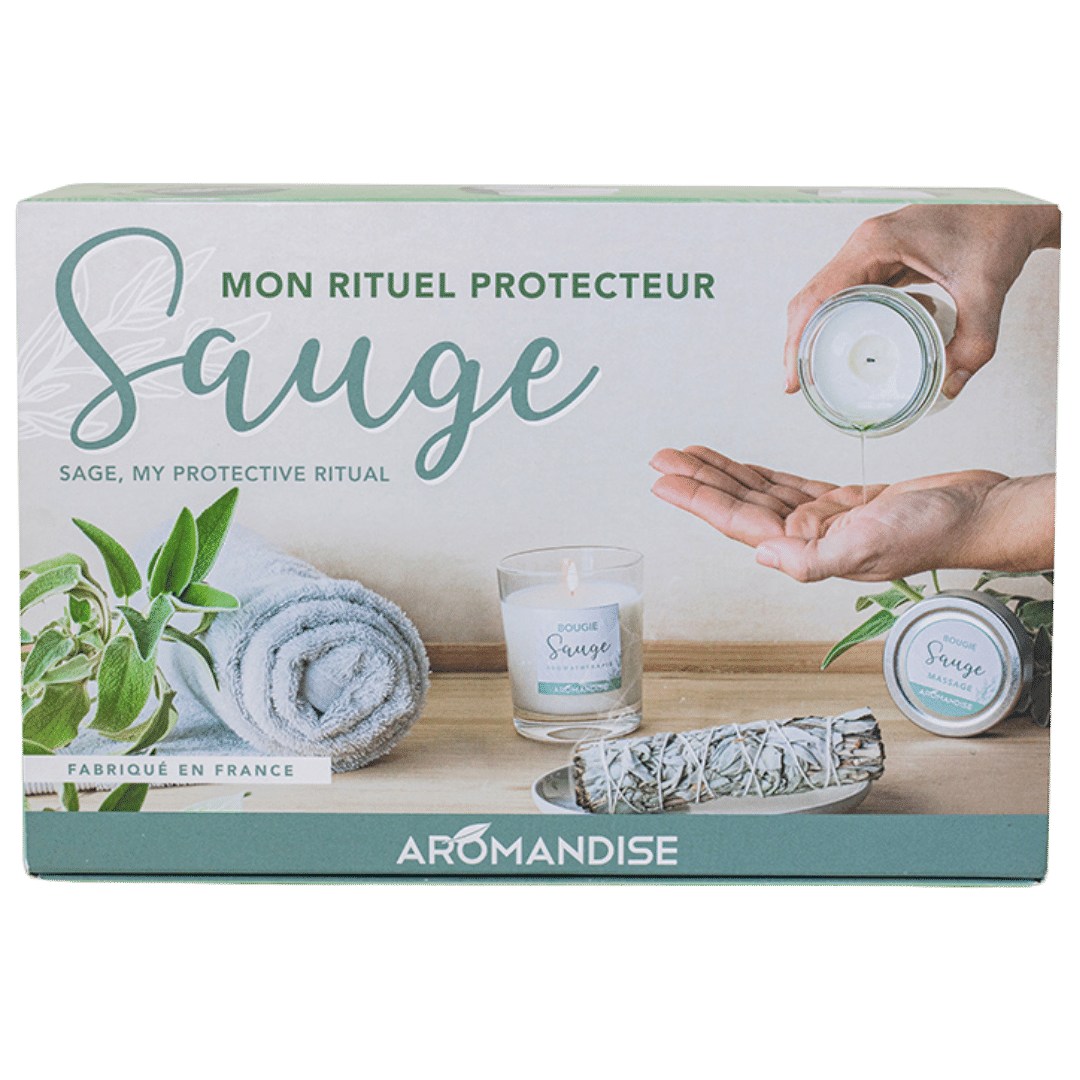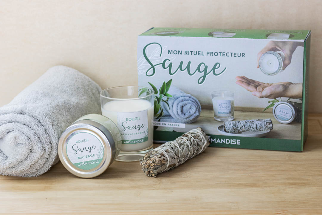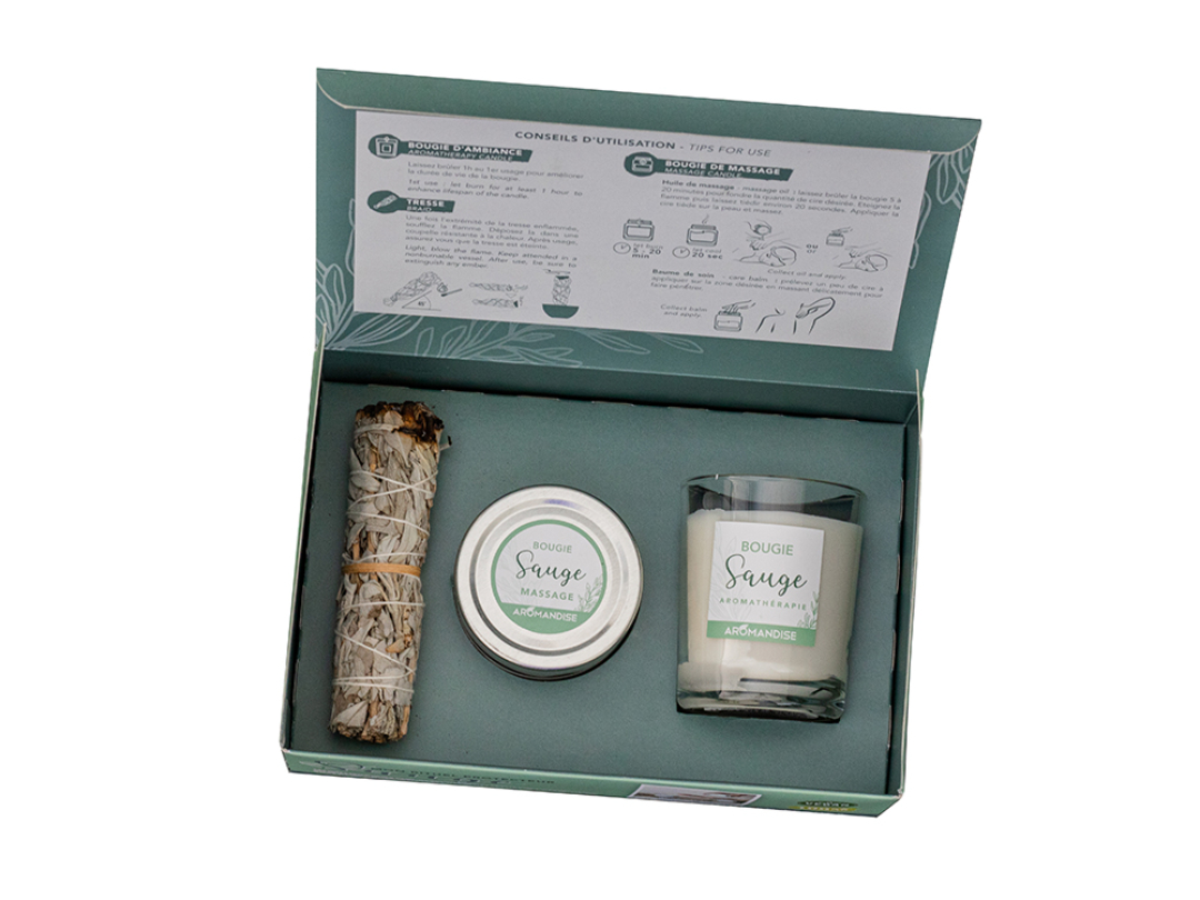 Eine Box mit einer Duftkerze Bio-Salbei, eine Massagekerze Salbei und einem Bündel Weißer Salbei zum Verbrennen.