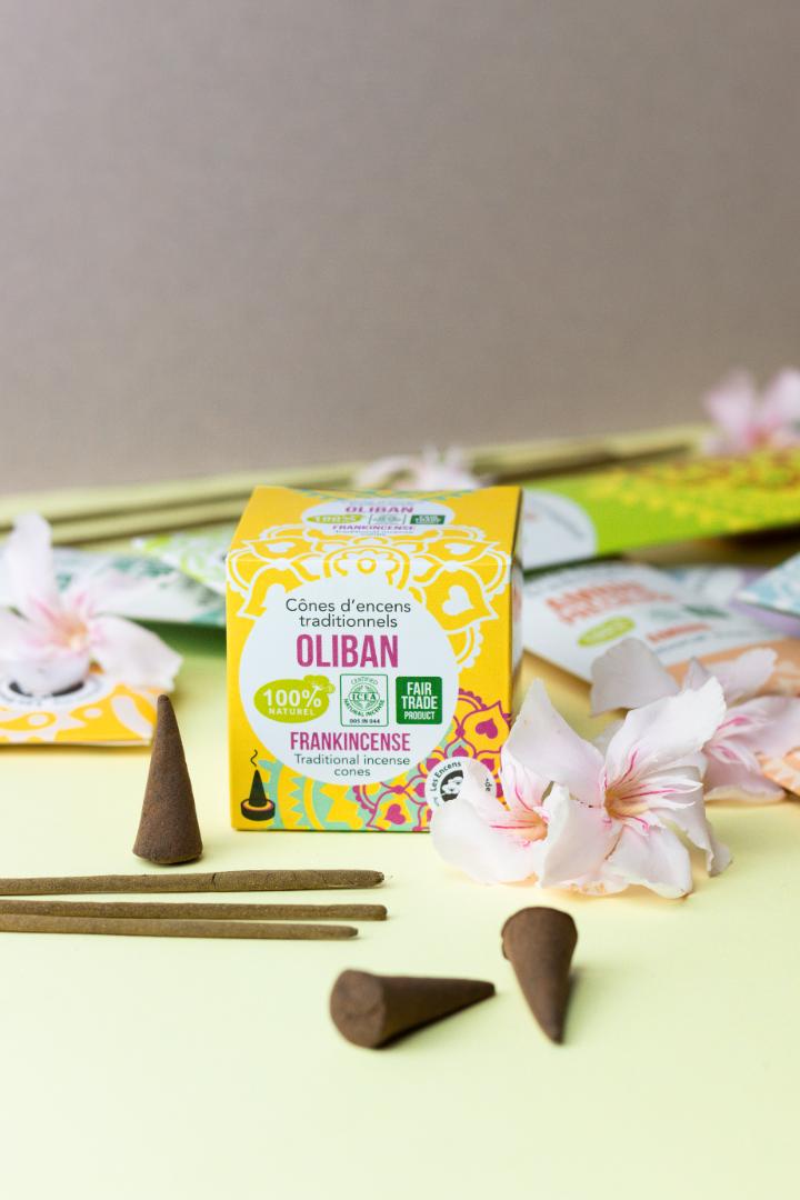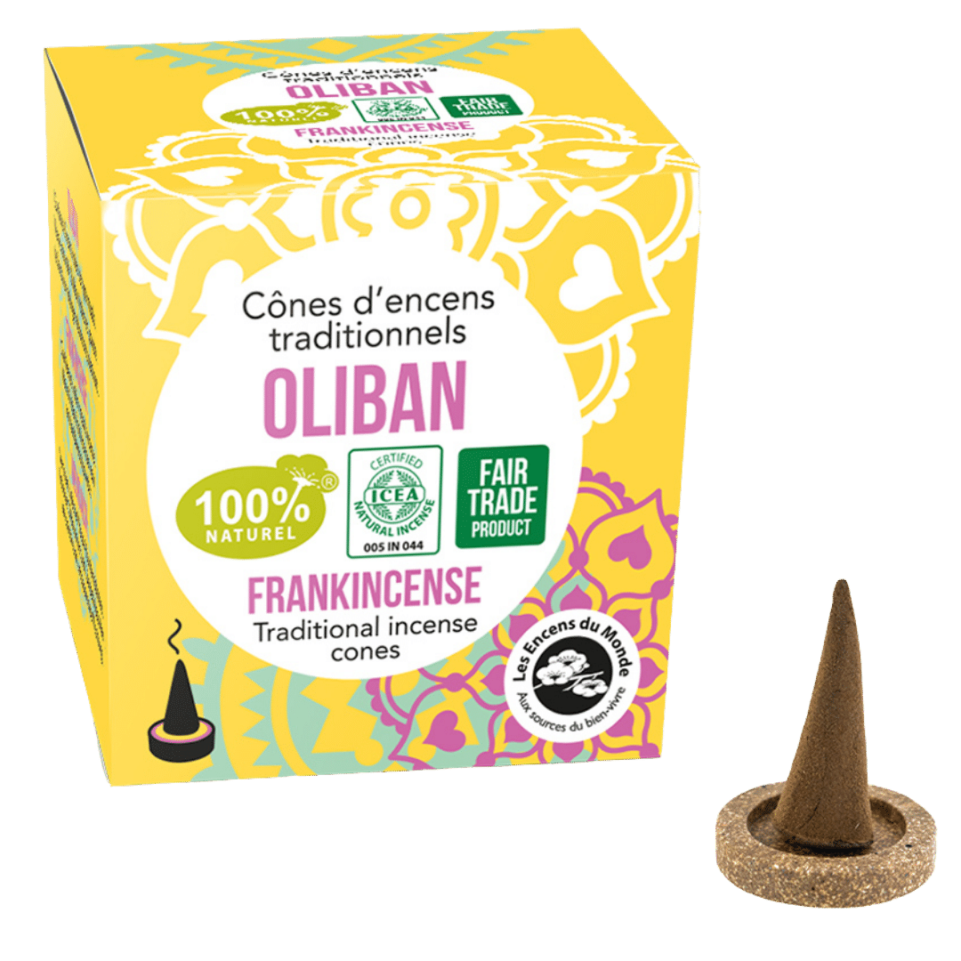 Vertrauen. Natürliches indisches Weihrauchharz und Sandelholzpulver, eine entspannende Mischung für gute Laune. Box mit 12 Kegeln mit 20 Minuten Brenndauer. Räucherwerkhalter inbegriffen.