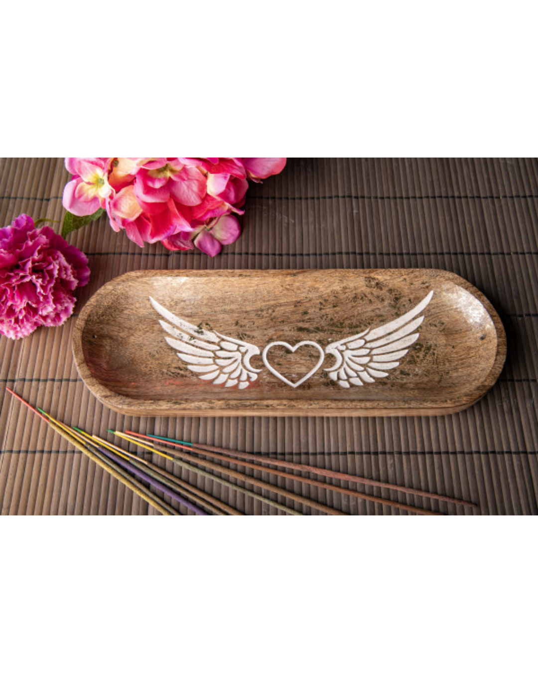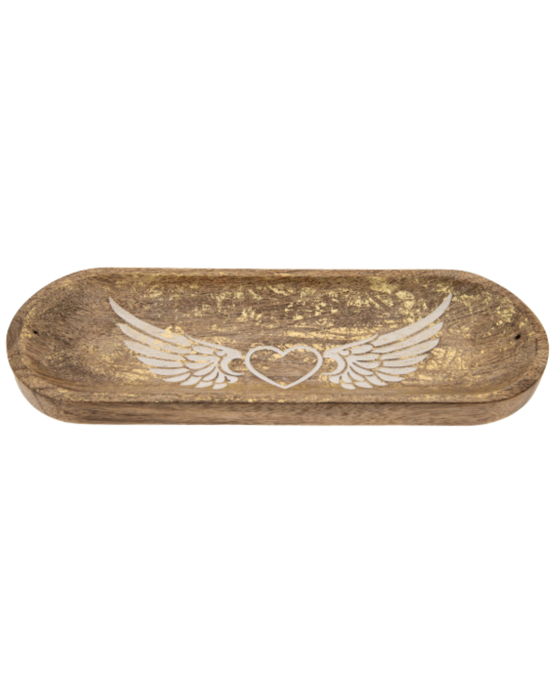 - Massiver, superbreiter Räucherstäbchenhalter Engelsflügel aus Mangoholz (27,5×10 cm) mit eingelaserter, weiß eingewachster Symbolgravur und Blattgoldverzierung. Robust, langlebig und dekorativ.