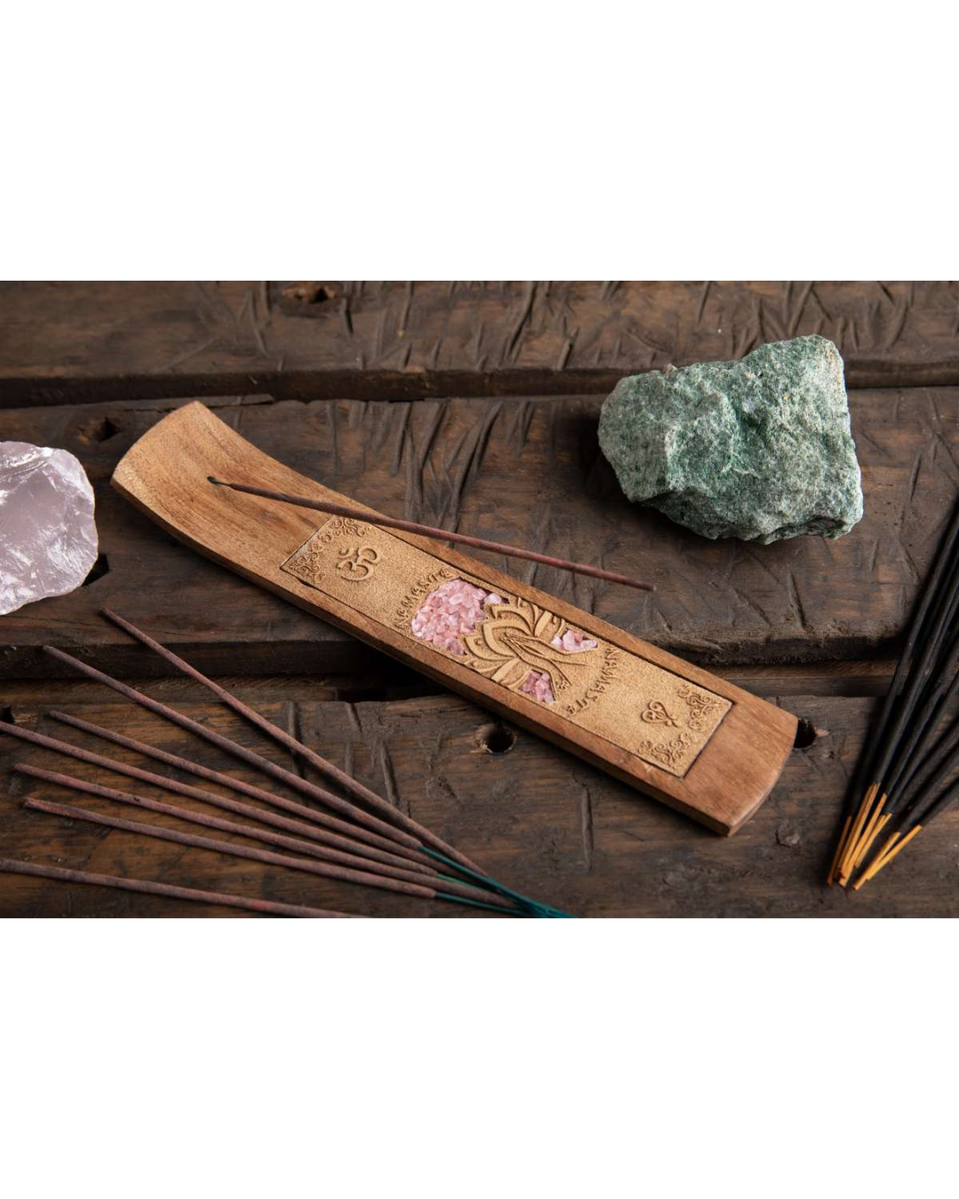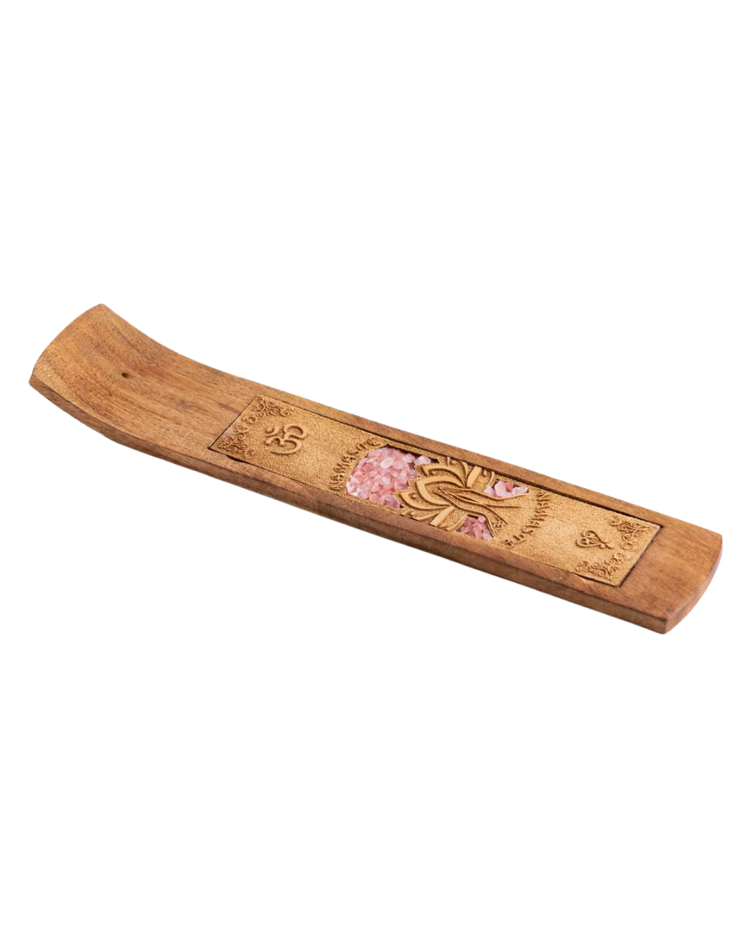 - Namaste Räucherstäbchenhalter aus Akazienholz mit echtem Rosenquarz. Feine Gravuren und eingebettete Mineralien verleihen dem edlen Räucherlebnis Stil ideal für Meditation oder als Geschenk.