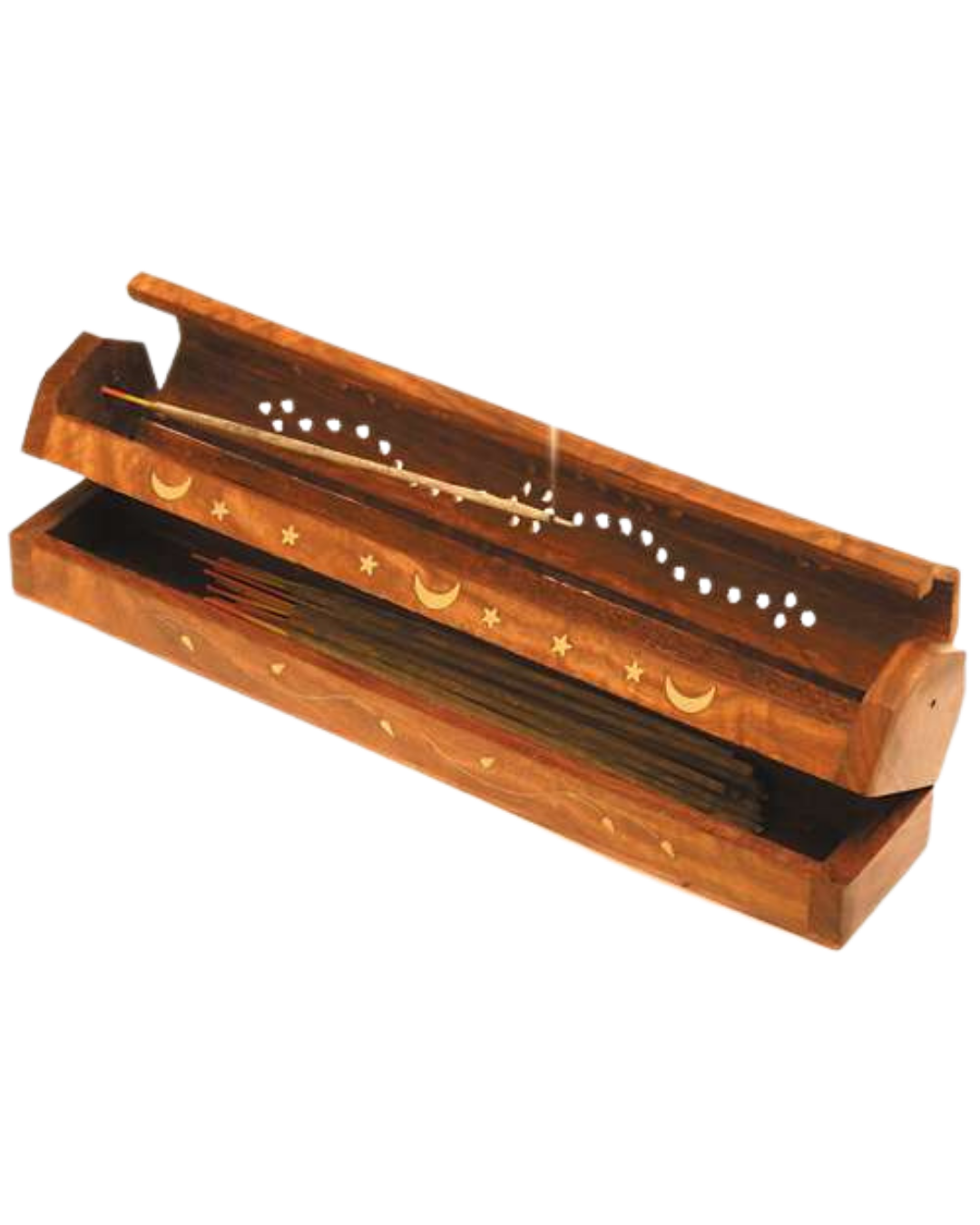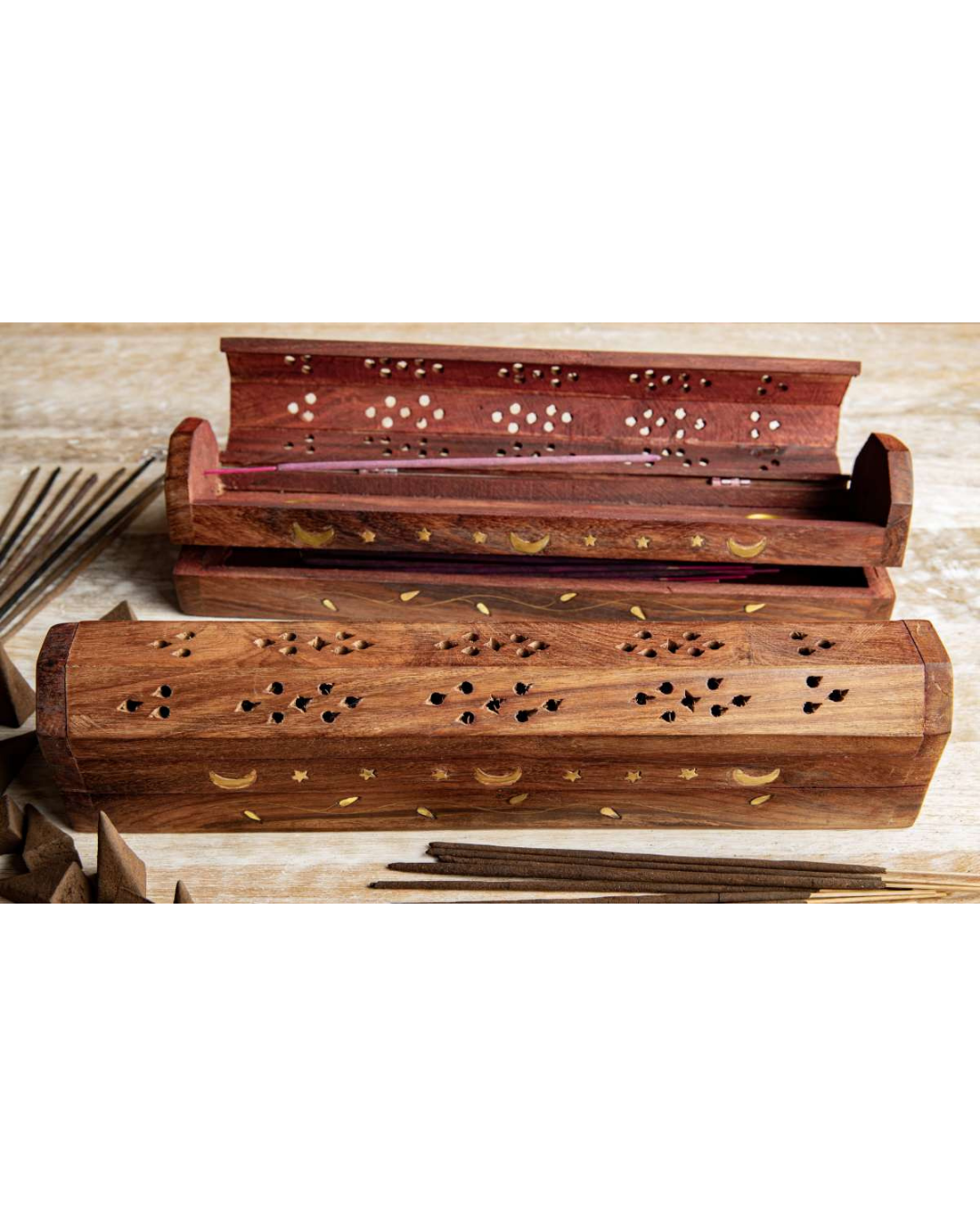 - Reisekiste: Räucherstäbchenhalter mit Vorratsbox - handgeschnitzt mit Messingeinlagen. Fasst Räucherstäbchen & -kegel, seitlich zu öffnen, ca. 30 cm. Ideal für unterwegs.