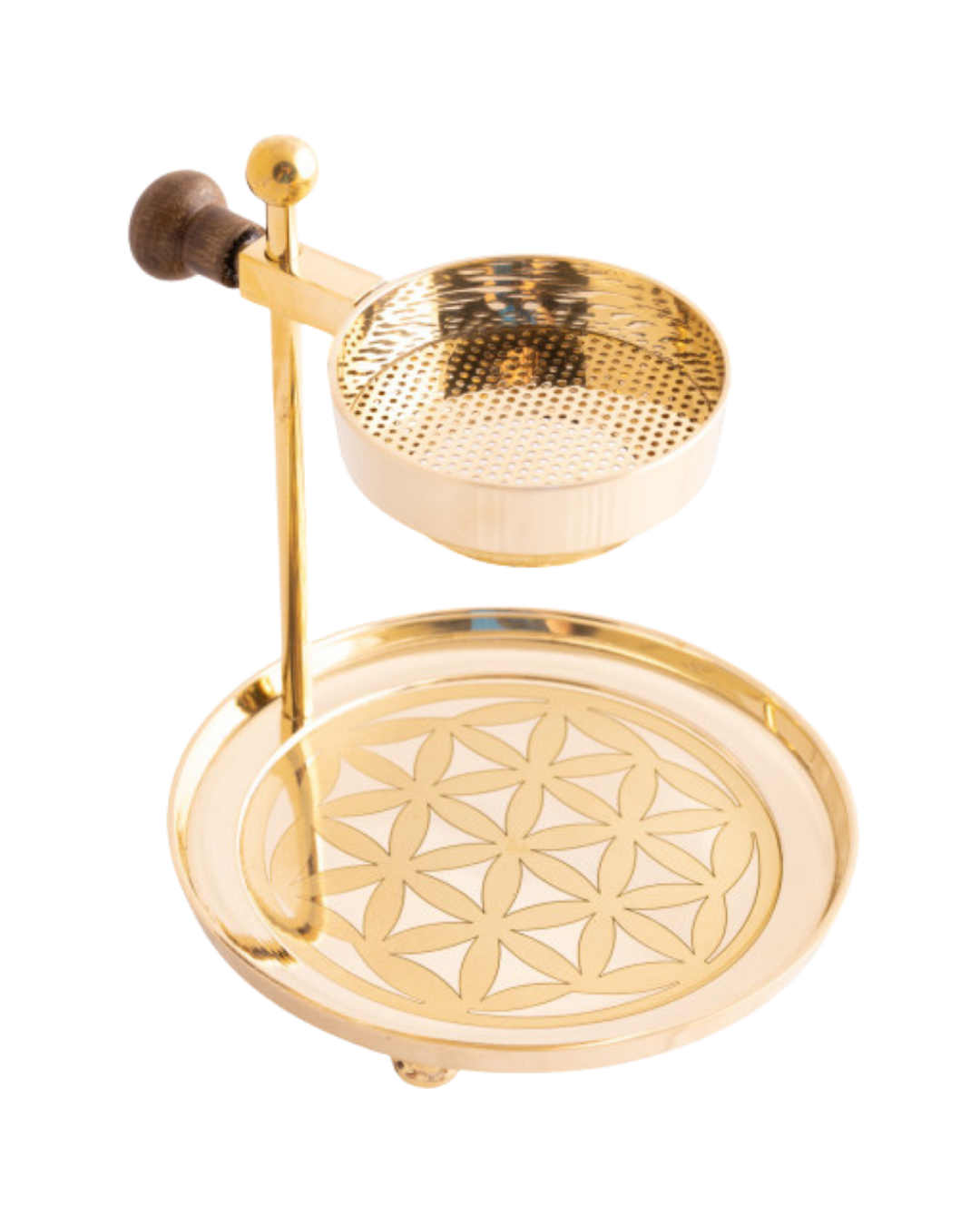 Höhenverstellbares Siebräuchergefäß mit eingravierter Blume des Lebens