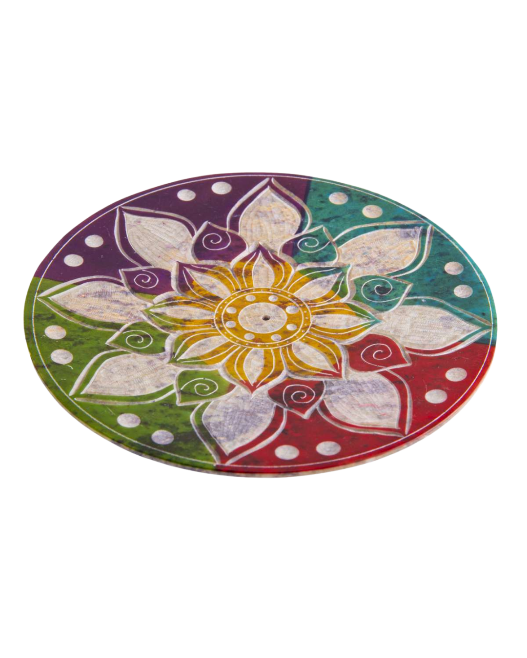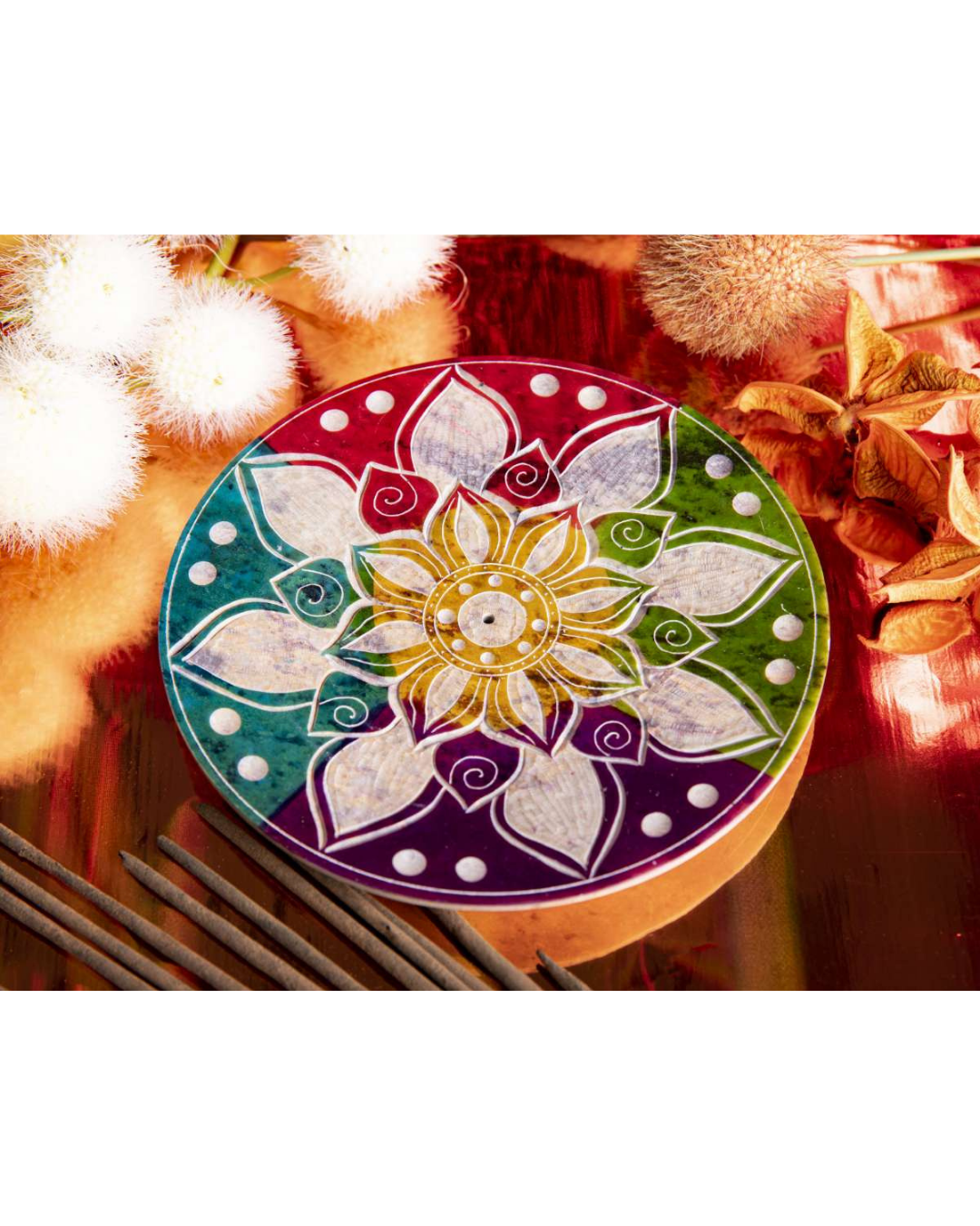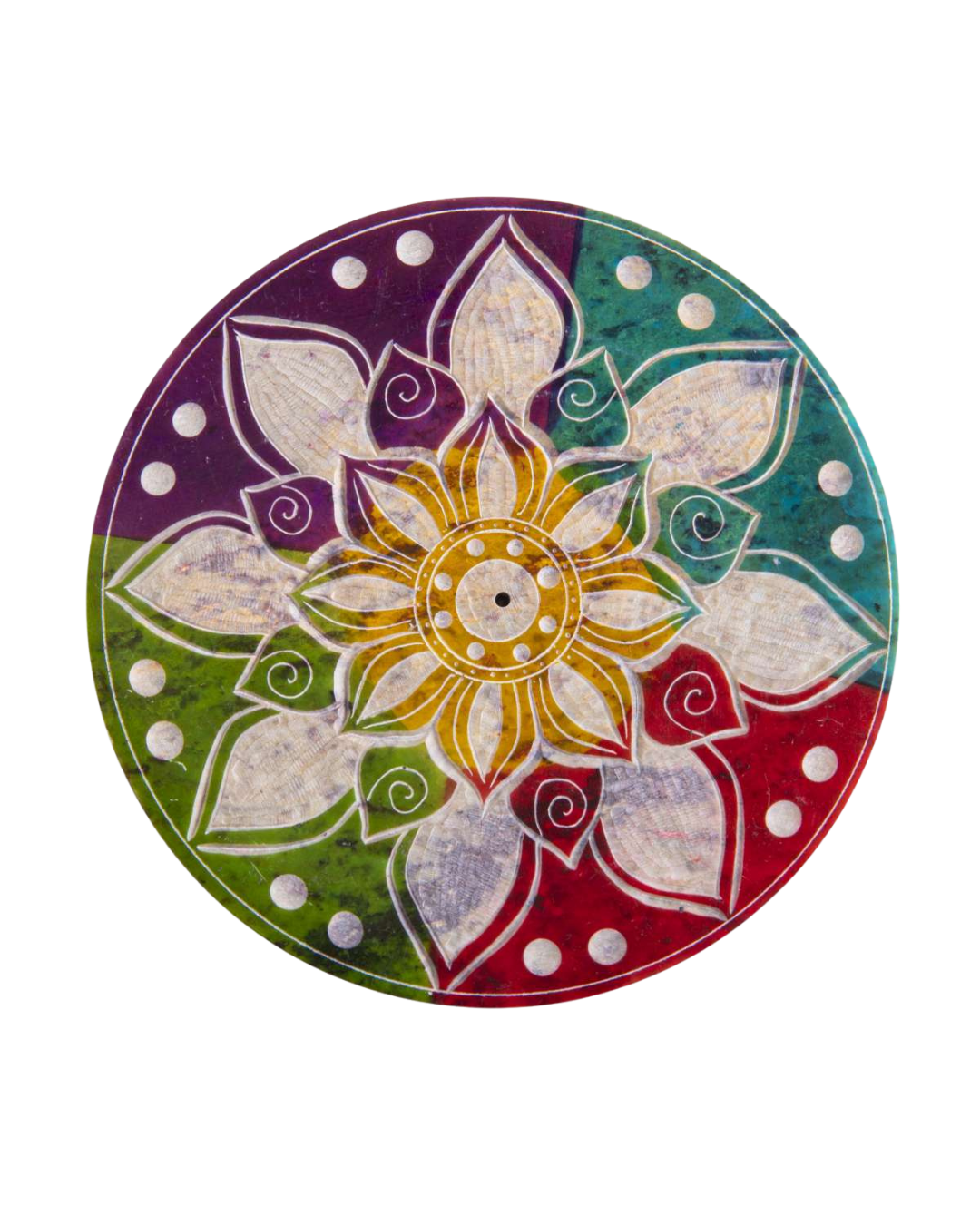 - Farbenfroher Specksteinhalter im Regenbogen-Mandala-Design. Handgearbeitet, robust und kompakt (Ø 12,7 cm) - ideal als dekoratives Highlight oder Geschenk für Zuhause.