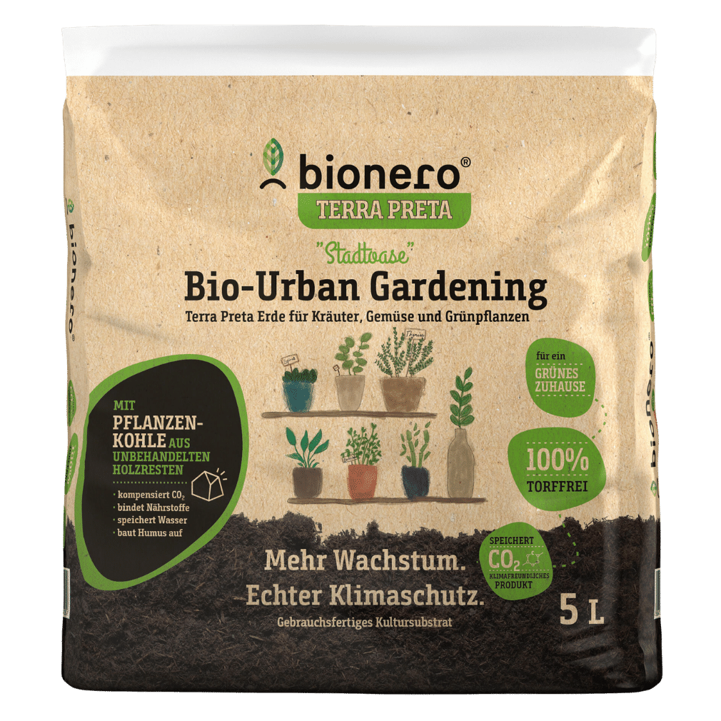 Die bionero Terra Preta Bio-Urban Gardening "Stadtoase" ist ein gebrauchsfertiges Kultursubstrat und kann ohne vorheriges Vermischen für Pflanzen aller Art, drinnen und draußen verwendet werden. Die Erde entsteht in einem langen Reifeprozess. Die beigesetzte, aktivierte Pflanzenkohle dient im Boden als optimaler Nährstoff- und Wasserspeicher und bietet wichtigen Lebensraum für essenzielle Mikroorganismen. Es wird bewusst auf Torf, Mineraldünger und andere CO2-intensive Rohstoffe verzichtet. Terra Preta ist eine im Amazonasgebiet wiederentdeckte Schwarzerde, die über außergewöhnliche Speicherkapazitäten verfügt und dadurch besonders fruchtbar ist. bionero hat das Herstellungsverfahren dieser fruchtbaren Schwarzerde modernisiert und optimiert und stellt so fruchtbare Schwarzerden made in Germany her. Regionale Produktion, kurze Transportwege, nachhaltige Wertschöpfungsketten, echter Klimaschutz: Bei der Auswahl aller Rohstoffe wird genau hingesehen und sich nur für wirklich nachhaltige Produkte entschieden. Durch das einzigartige Produktionsverfahren gelingt es bionero, mehr CO2 aus der Atmosphäre zu entziehen, als emittiert wird. Mehr dazu unter www.bionero.de