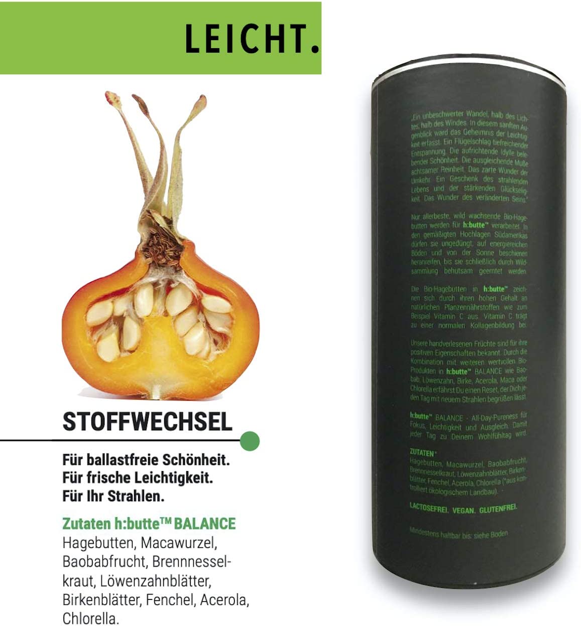 Durch die Kombination unserer Bio-Hagebutten mit wertvollen Premium-Produkten aus kontrolliert ökologischem Landbau wie Baobab, Löwenzahn, Birke, Acerola, Maca oder Chlorella erfährst Du einen Reset, der Dich jeden Tag mit freudigem Strahlen begrüßen lässt. h:butte™ BALANCE: All-Day-Pureness, Frische, Leichtigkeit und Ausgleich. Weil jeder Tag Dein Wohlfühltag ist. Die Packung entspricht einer Monatskur und enthält 275 Gramm.
