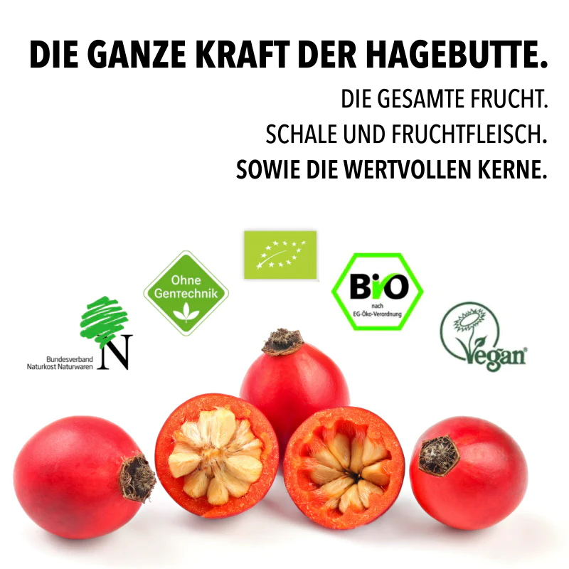 Die zahlreichen Inhaltsstoffe, die in unserem Hagebuttenpulver enthalten sind, besitzen viele positive Eigenschaften. Vitamin C sowie der geballt in ausgewählten Sorten vorkommende Galaktolipid soll reichlich in der Hagebutte vorhanden sein. Dies macht Früchte aus Wildlese zu echten Powerfrüchten.