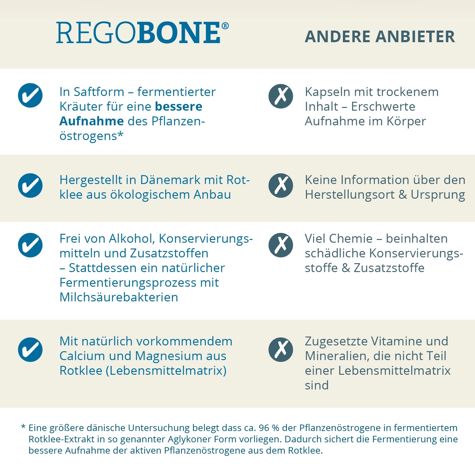 Der Fermentierungsprozess, dem der Rotklee unterzogen wird, ist das Herzstück von REGOBONE®. Er sorgt dafür, dass die wertvollen Pflanzenöstrogene in einer Form vorliegen, die vom Körper optimal aufgenommen werden kann. Dieser Prozess, bei dem die Pflanzen in einem einzigen Schritt gepresst und fermentiert werden, garantiert, dass du von jedem Tropfen die maximale Wirkung erhältst.