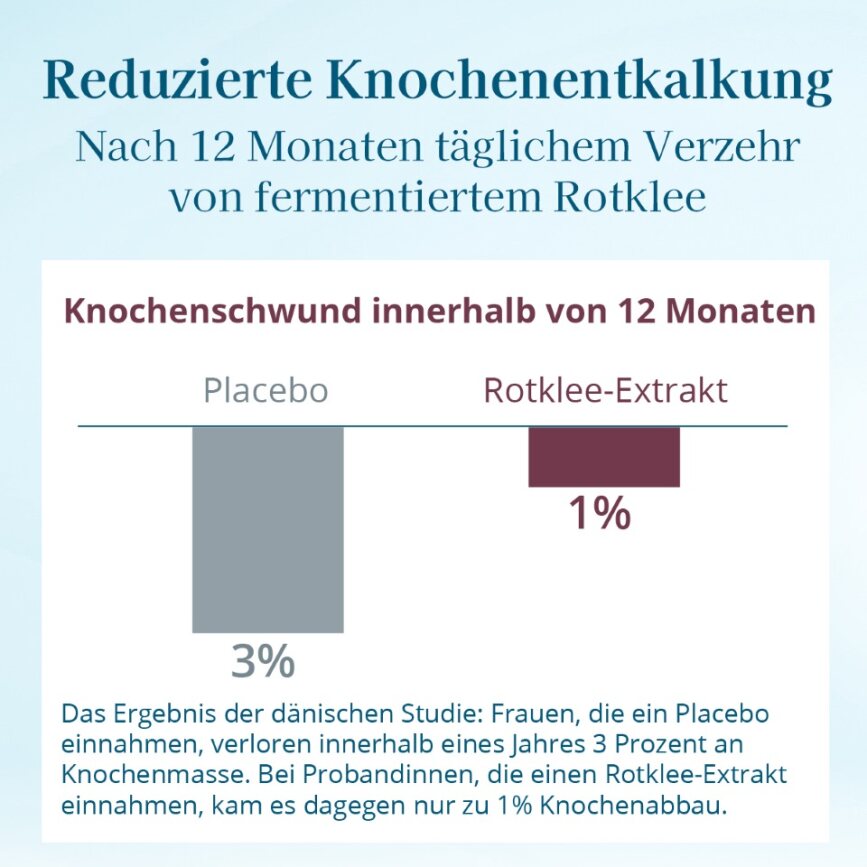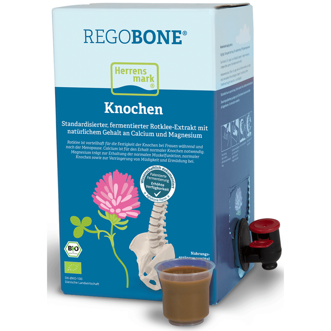 Rotklee, ein Schlüsselelement in REGOBONE®, ist bekannt für seine positiven Auswirkungen auf die Knochenfestigkeit, insbesondere bei Frauen während und nach der Menopause. Durch einen einzigartigen Fermentierungsprozess wird der Rotklee so aufbereitet, dass die Aufnahme der aktiven Pflanzenstoffe, insbesondere der Isoflavone, optimiert wird. Diese natürlichen Pflanzenöstrogene tragen zur Erhaltung normaler Knochen bei, indem sie eine Schlüsselrolle in der Mineralstoffbalance des Körpers spielen.