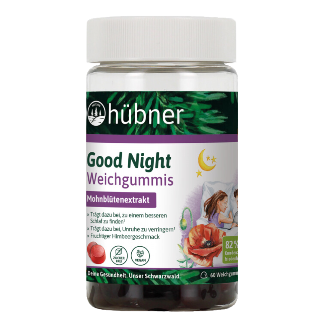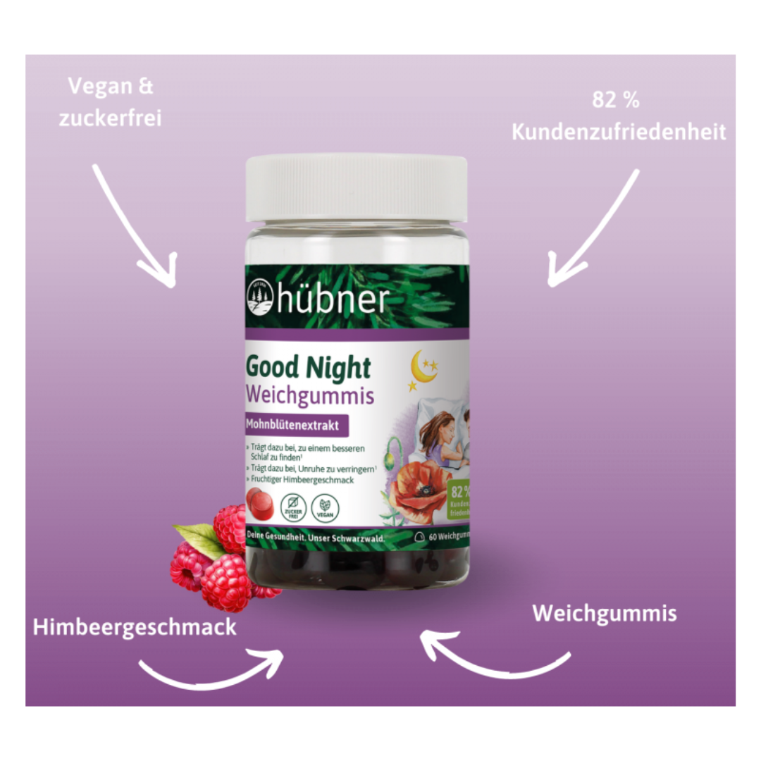 hübner® Good Night Weichgummis mit Klatschmohnblüten-Extrakt sind ohne Zucker, gluten- und laktosefrei, vegan und ohne künstliche Aromen sowie Farbstoffe. Sie können jederzeit ohne Wasser verzehrt werden, was sie besonders praktisch macht. Mit einem angenehmen Himbeergeschmack sind sie nicht nur angenehm, sondern auch ein Genuss.