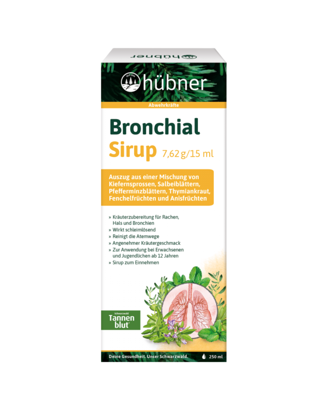 Seit 1922 überzeugt der Bronchial-Sirup aus dem Schwarzwald und unterstützt den menschlichen Körper. Der hübner® Bronchial-Sirup als Traditionsprodukt und natürliches Arzneimittel setzt sich aus zahlreichen Kräutern zusammen und verhilft besonders zur Schleimlösung in Rachen, Hals und Bronchien. Der Sirup ist außerdem vegetarisch und frei von Alkohol, Lactose und Gluten.