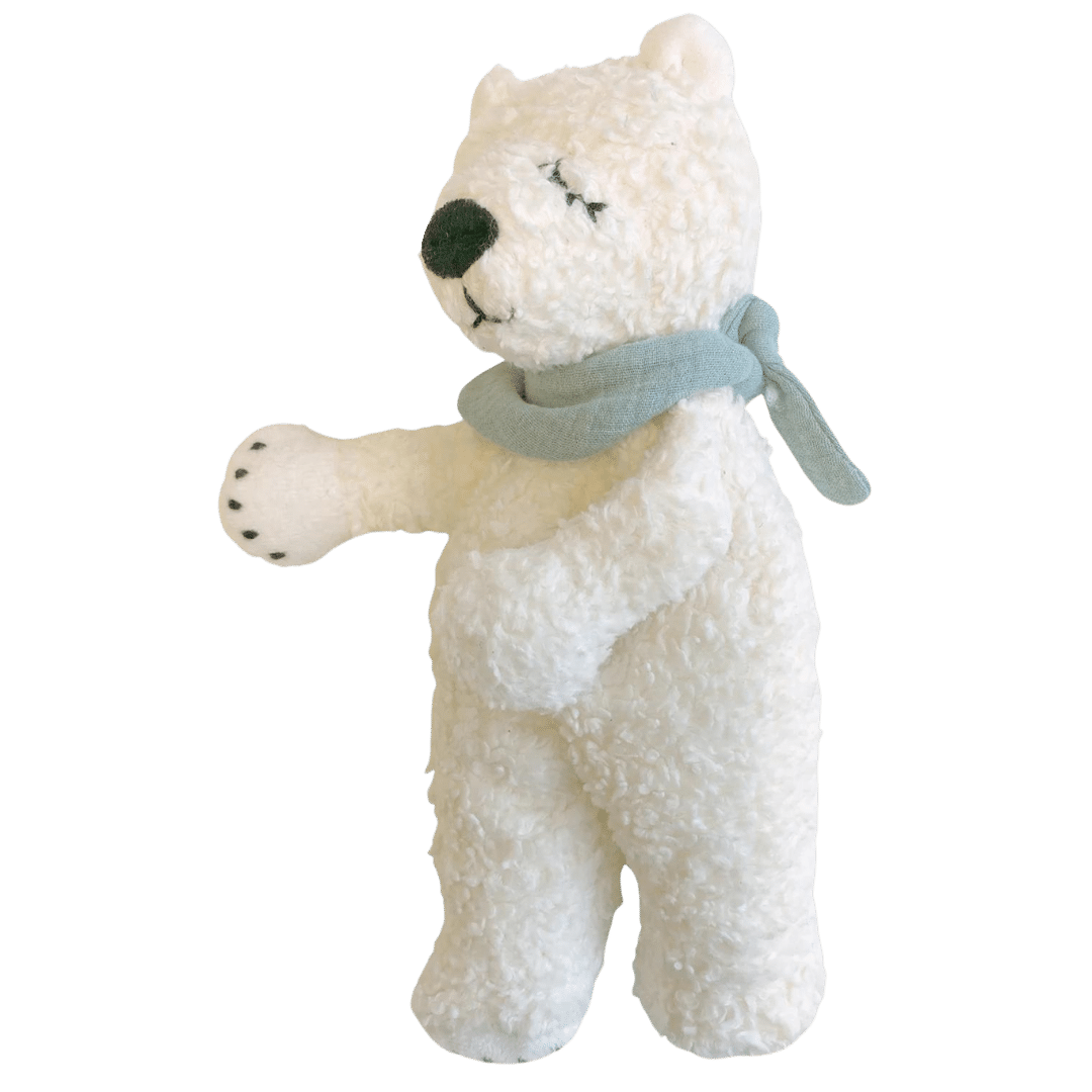Der Eisbär ist aus 100% Bio-Baumwolle hergestellt und mit recyceltem Polyester gefüllt, was ihn nicht nur umweltfreundlich, sondern auch besonders sanft zum Anfassen macht. Seine weiche Beschaffenheit macht ihn zu einem perfekten Kuschelgefährten für die Kleinen, insbesondere während des Schlafens oder beim Entspannen.