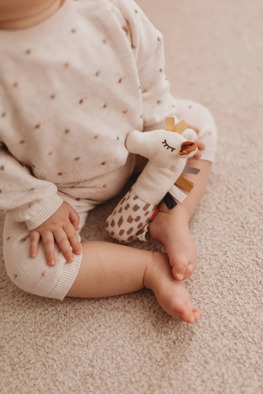 Diese Giraffe ist aus 100% Biobaumwolle gefertigt und GOTS-zertifiziert, was sicherstellt, dass sie unter fairen und umweltschonenden Bedingungen hergestellt wurde. Die Verwendung von Bio-Baumwolle garantiert, dass das Spielzeug frei von schädlichen Chemikalien ist, was es besonders sicher für Ihr Baby macht.