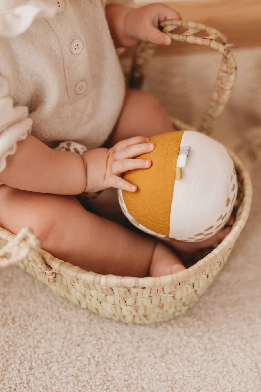 Besonders hervorzuheben ist die Füllung des Rasselballs, die aus recyceltem Stoff von PET-Flaschen besteht. Diese nachhaltige Wahl trägt nicht nur zum Umweltschutz bei, sondern sorgt auch dafür, dass der Ball nach dem Waschen schnell trocknet und seine Form behält. Das Äußere des Balls ist aus 100% Biobaumwolle gefertigt, was ihn besonders sanft zu zarten Babyhänden macht.
