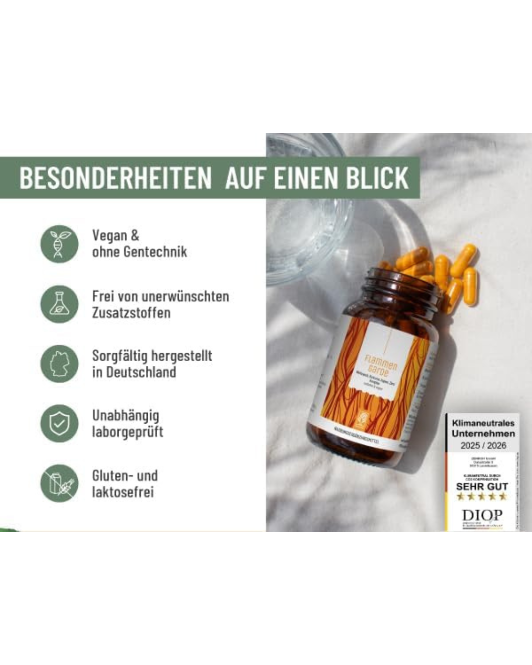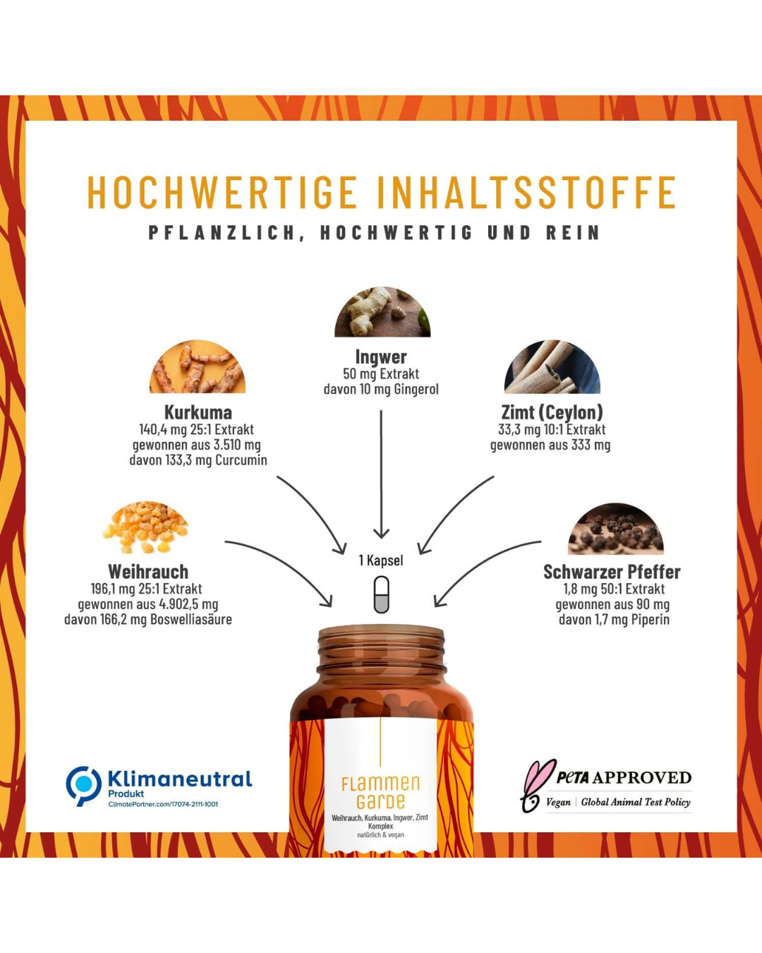 Weihrauch-Extrakt 25:1 (Boswellia serrata, davon 85 % Boswelliasäure), Kurkuma-Extrakt 25:1 (davon 95 % Curcumin), Ingwer-Extrakt (davon 20 % Gingerol), Überzugsmittel: Hydroxypropylmethylcellulose (pflanzliche Kapselhülle), Zimt-Extrakt 10:1, Schwarzer Pfeffer-Extrakt 50:1 (davon 94,3 % Piperin).