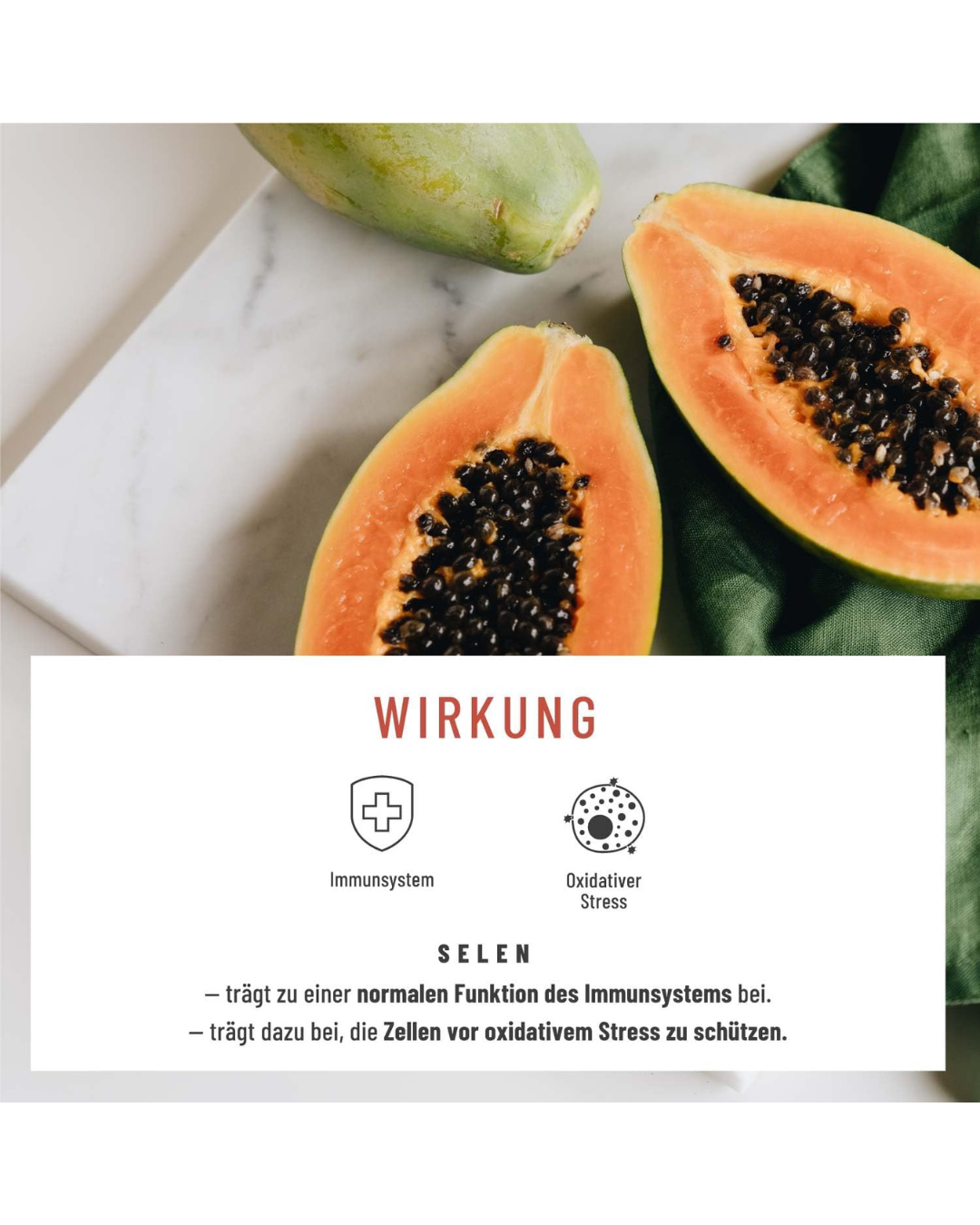 67,5 % Bromelain 2.500 GDU/g, Überzugsmittel: magensaftresistente Hydroxypropylmethylcellulose (pflanzliche Kapselhülle), 6,75 % Papain 6.000 USP-U/mg, Japanischer Schnurbaum-Extrak 5:1 (Sophora Japonica, enthält 95 % Rutin), Selenomethionin. keine Zutatenlegende (100% konventionelle Zutaten)