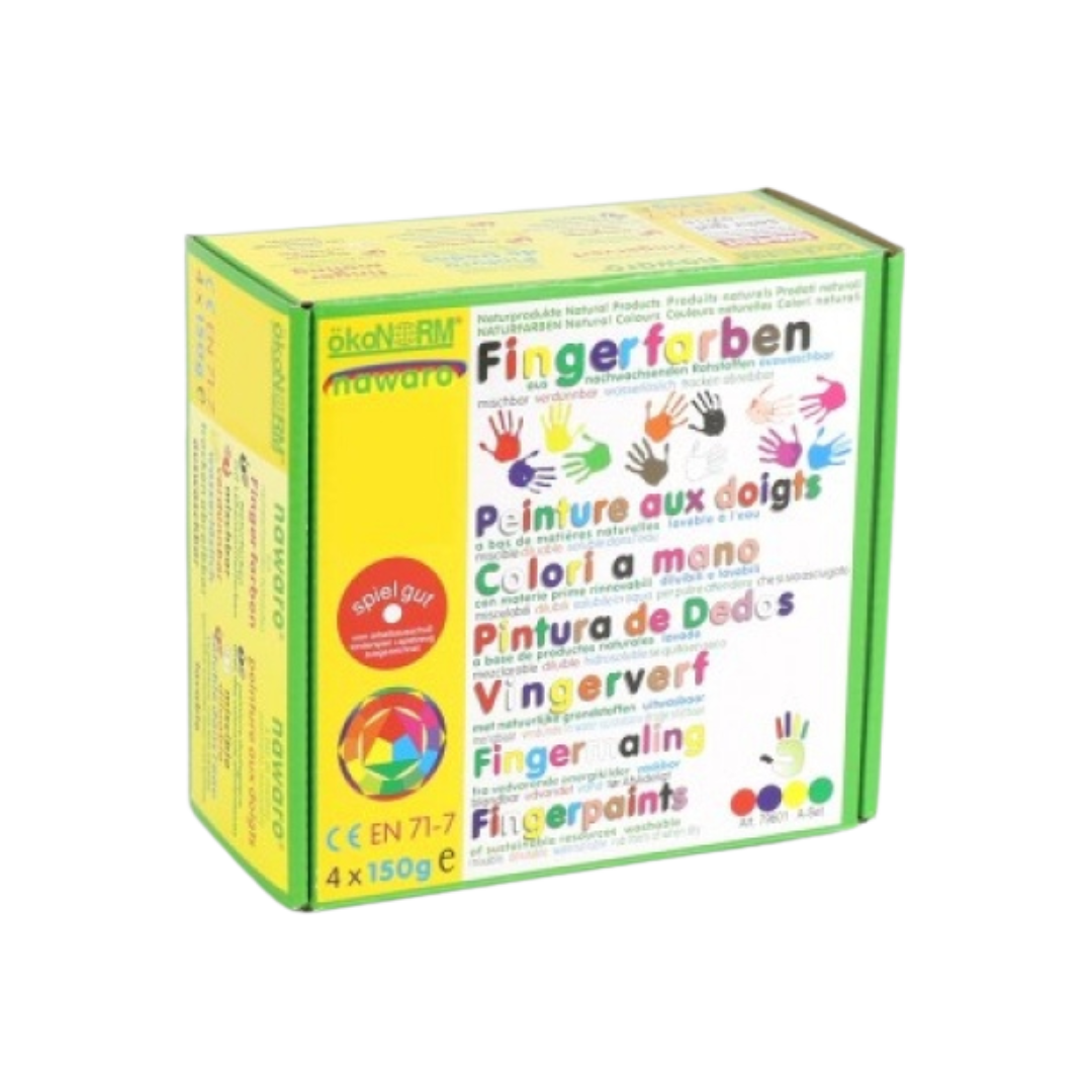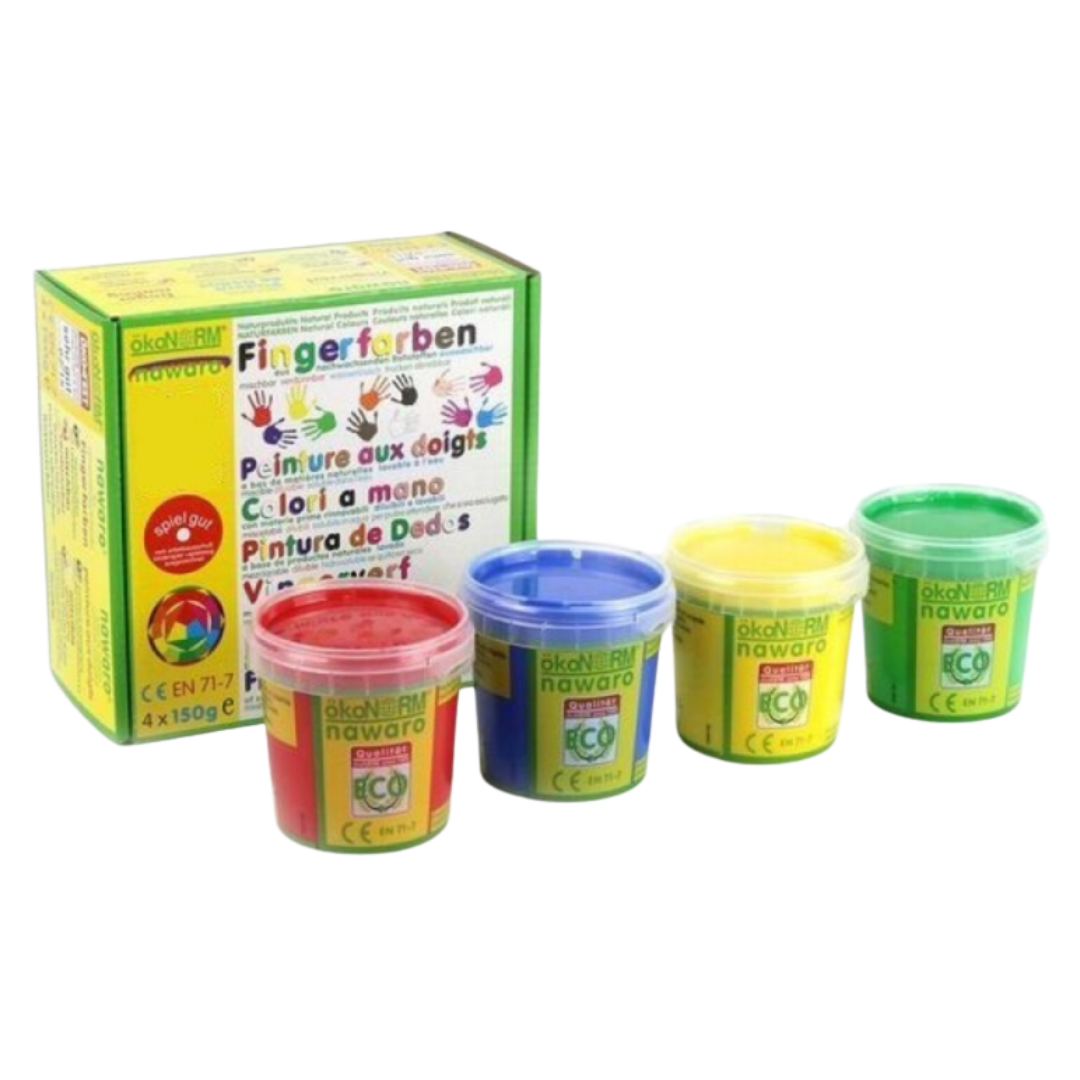Tauche ein in ein farbenfrohes Abenteuer mit dem nawaro Fingerfarben 4er Set A - rot, gelb, grün, blau!