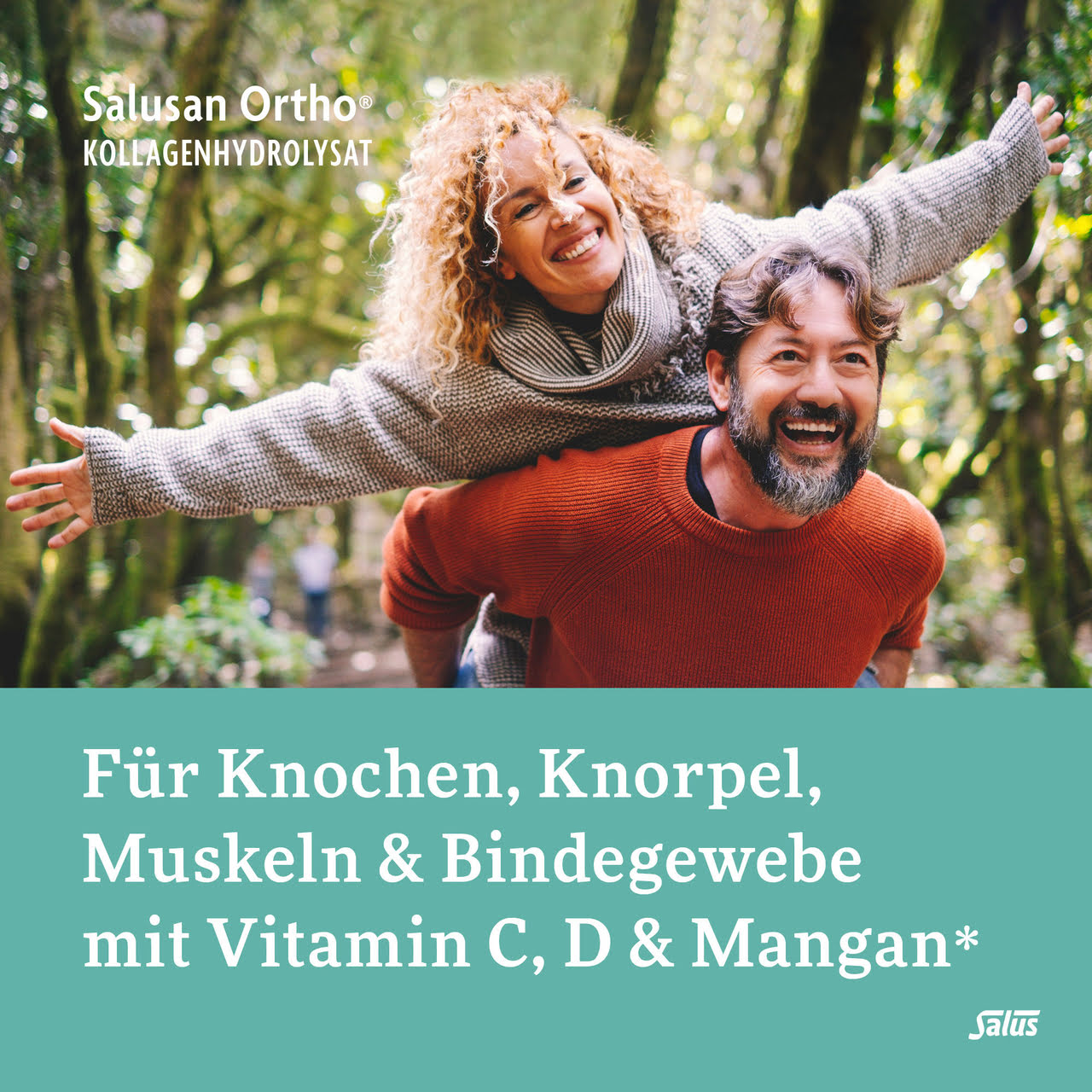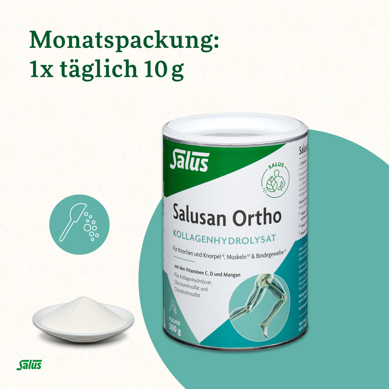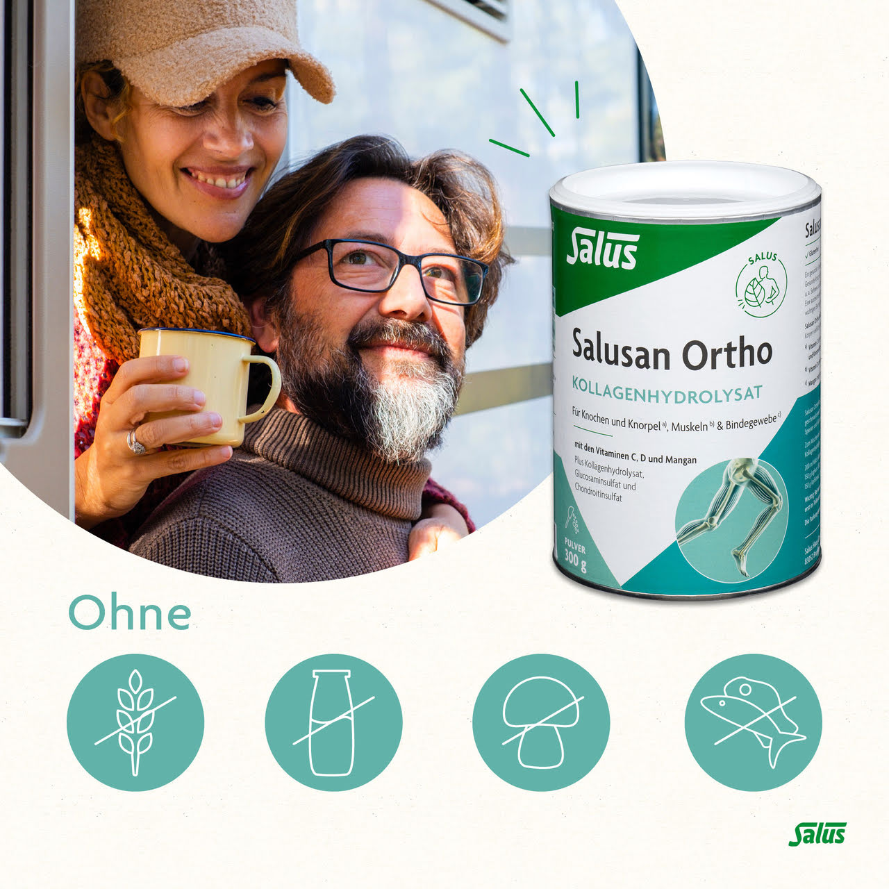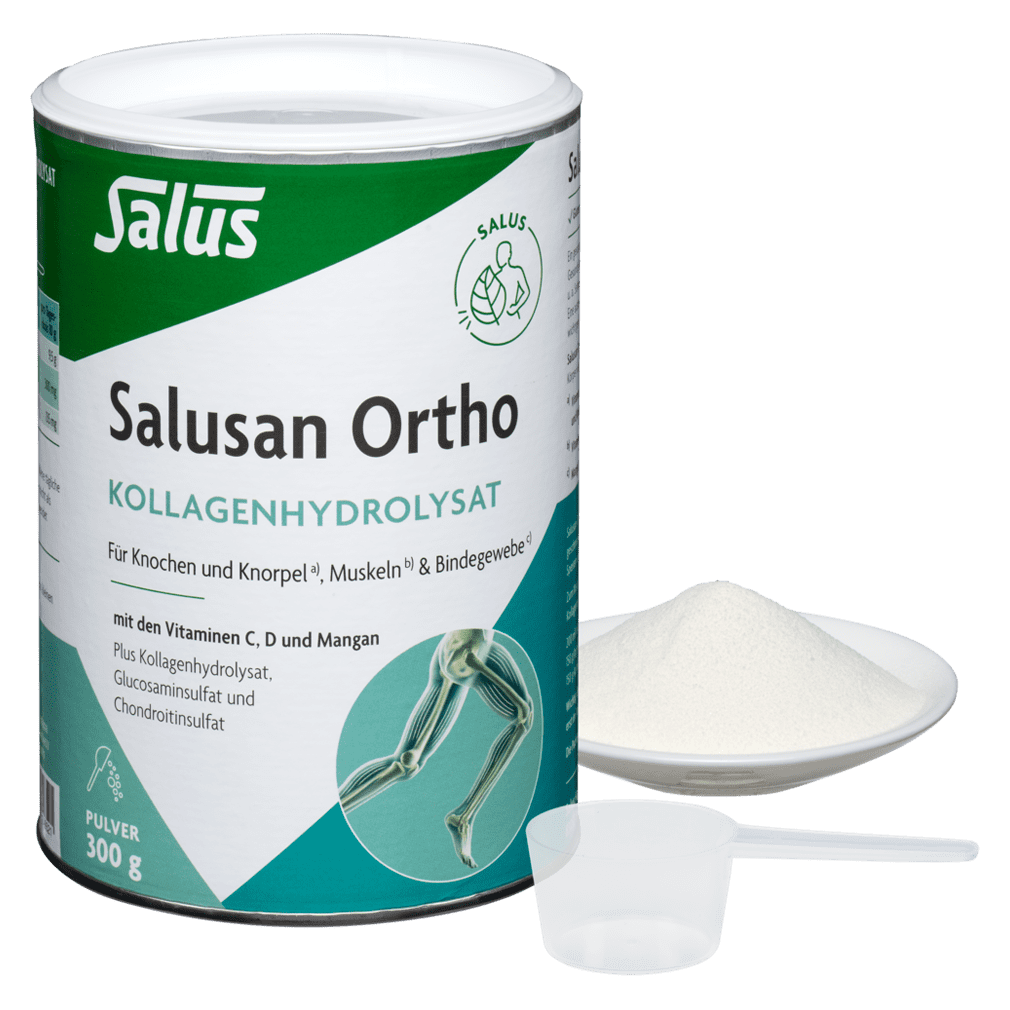 Ein gesunder Bewegungsapparat ist die Basis für Lebensqualität in jedem Alter. Um die normale Funktion von Knochen, Knorpel, Muskeln, Bindegewebe und kollagenen Strukturen zu unterstützen, liefert Salusan Ortho Kollagenhydrolysat-Pulver wichtige Nährstoffe, die deinem Körper helfen, gesund und vital zu bleiben.