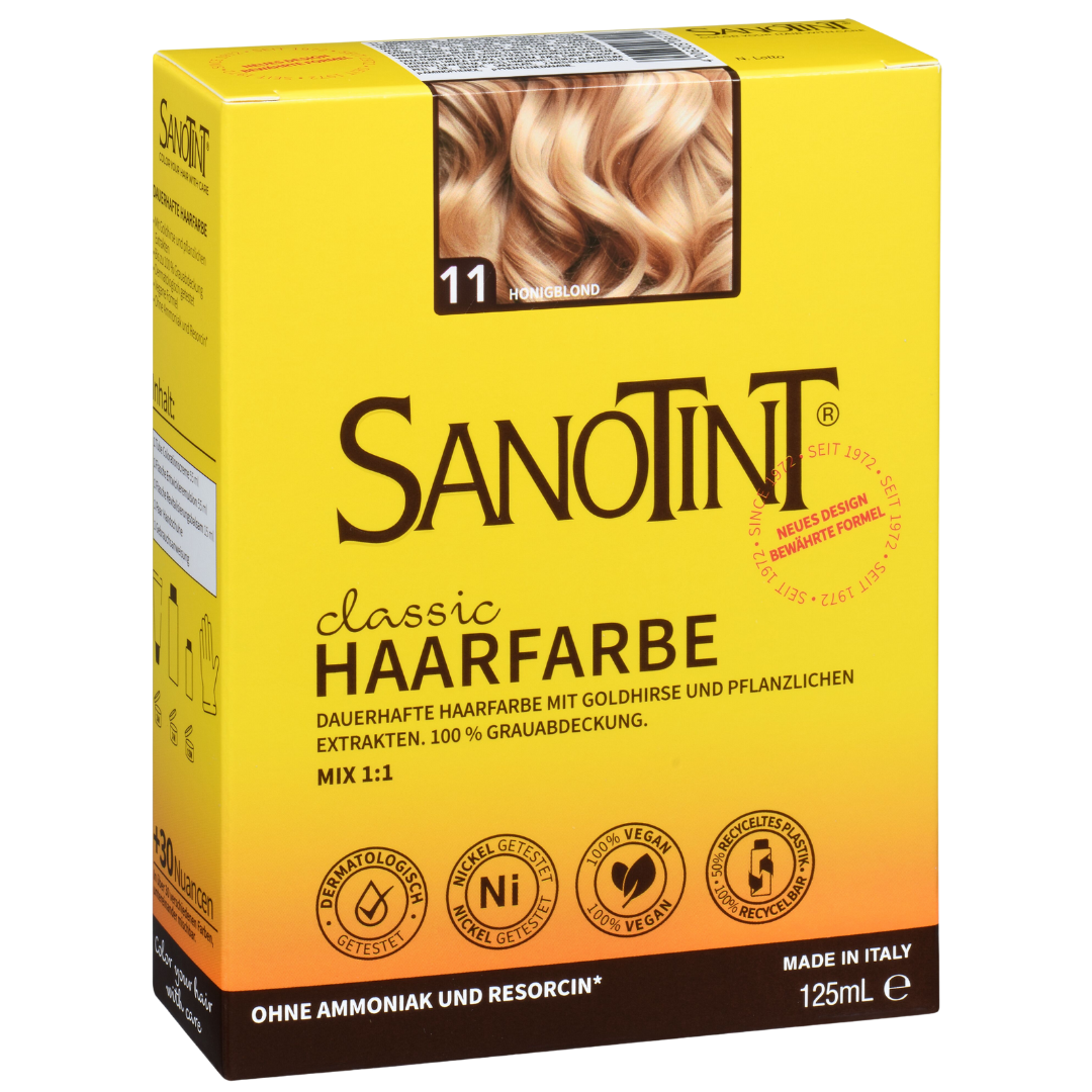 Die Sanotint Classic Linie wird von Walther Schoenenberger in Italien produziert und steht seit Jahren für innovative, naturnahe Haarfarben. Das Unternehmen hat es sich zur Aufgabe gemacht, außergewöhnliche Farbnuancen wie die Honigblond Nr. 11 zu entwickeln, die sich durch ihre besondere Wärme und Leuchtkraft auszeichnen und individuelle Styling-Wünsche erfüllen.