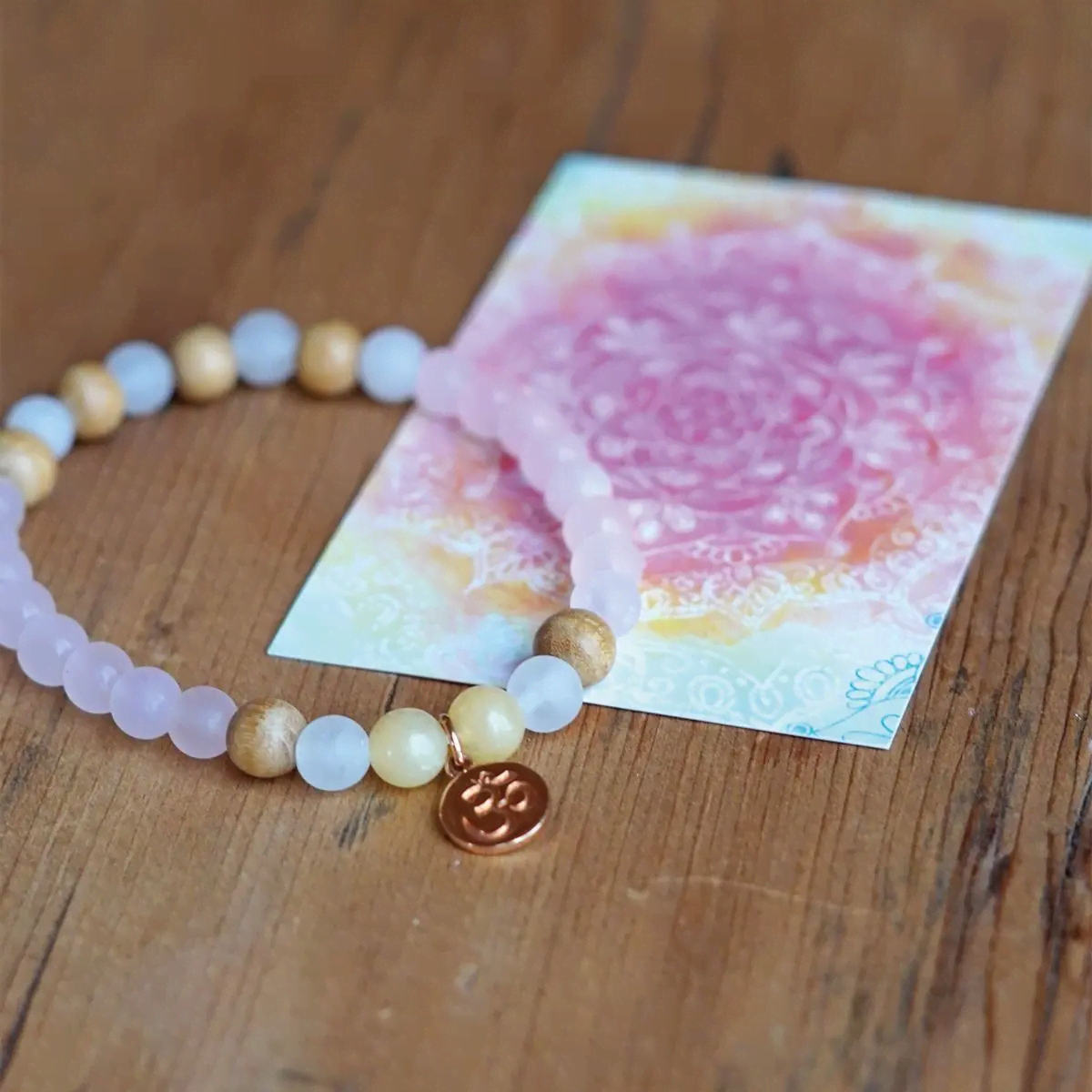 Tauche ein in die Welt der Liebe und Harmonie mit unserem Rosenquarz Armband. Dieses Schmuckstück ist eine Hommage an die Liebe in all ihren Formen: Selbstliebe, Mitgefühl, Sensibilität und die Stärkung von Beziehungen. Umrahmt von Schneequarz und Orangencalcit, vereint dieses Armband sanfte Energie mit beruhigender Klarheit und Lebensfreude. Der Rosenquarz, bekannt als Stein der Liebe, wirkt beruhigend auf das Herz und fördert ein Gefühl der Verbundenheit. Er wird ergänzt durch Perlen aus Schneequarz, die für Reinheit und klares Denken stehen, und Perlen aus Orangencalcit, die Selbstvertrauen und Optimismus stärken. Das Ensemble wird vervollständigt durch die wärmende Präsenz des Sandelholzes, das für innere Mitte und Harmonie sorgt.