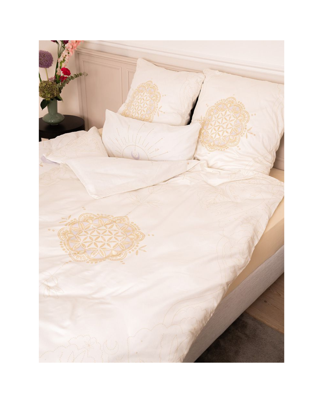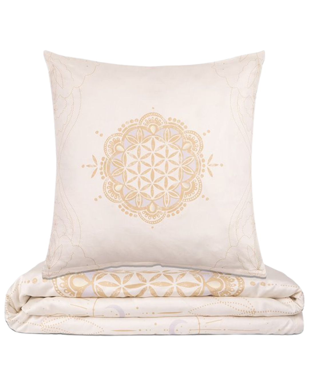 Sanfte Träume beginnen mit dem richtigen Umfeld – und genau das schafft die Bio-Bettwäsche Light Dream. Ihr harmonisches Design aus cremefarbenem Grundton und goldfarbenen Ornamenten, inspiriert von der Blume des Lebens, verleiht deinem Schlafzimmer eine ruhige, klare und zugleich edle Atmosphäre. Die Kombination aus feiner Bio-Baumwolle und wärmender Biberqualität sorgt für ein angenehmes Schlafklima in jeder Jahreszeit.
