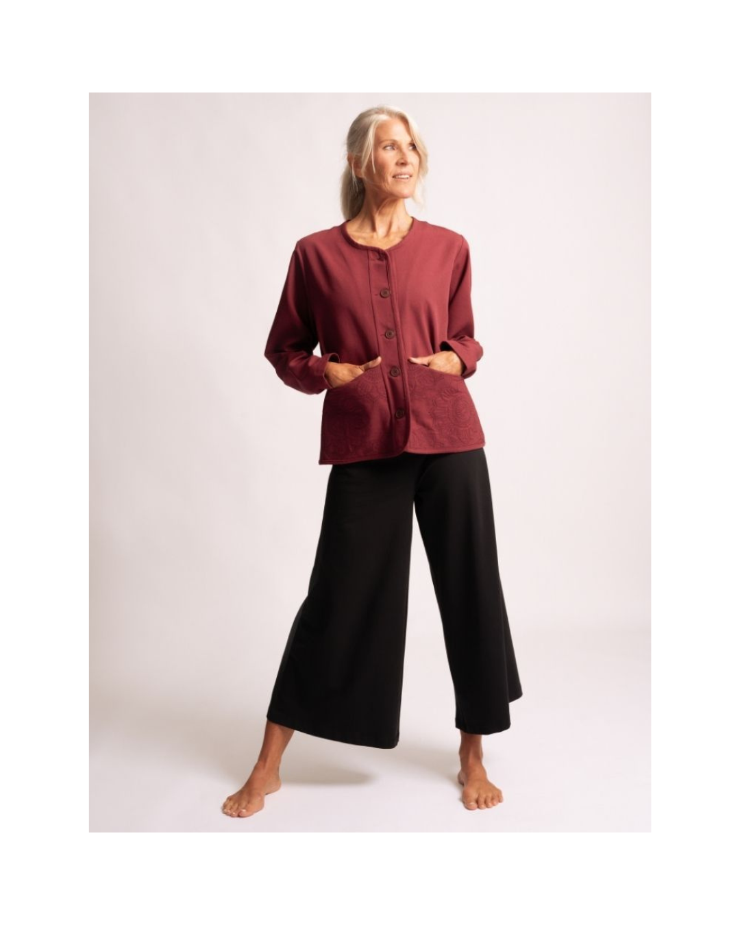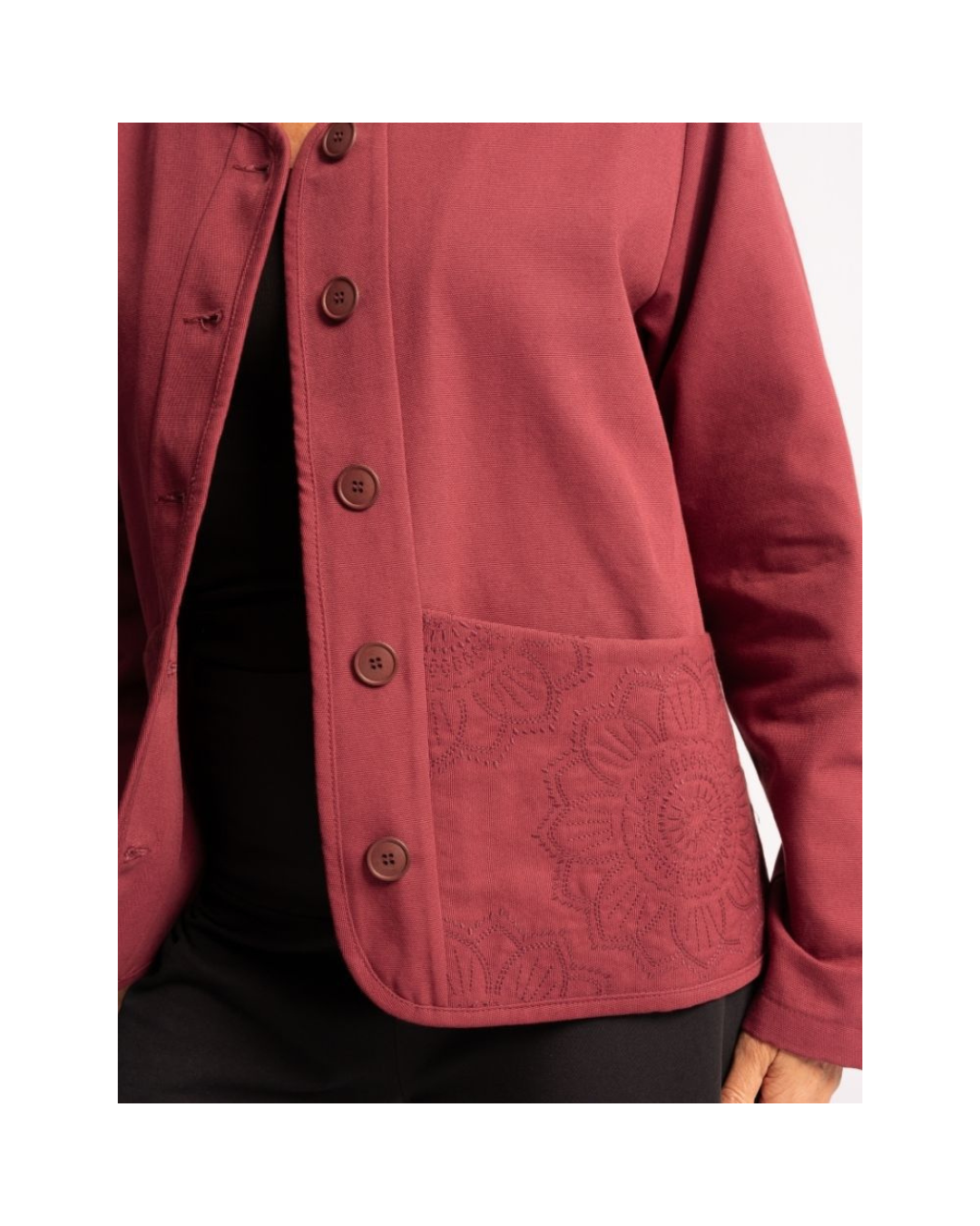 Die Jacke stammt aus einer Kollektion, die für achtsame Designs, hochwertige Stoffe und faire Produktion steht. Spirit of OM verbindet traditionelle Handwerkselemente mit moderner Mode und schafft Kleidung, die sich angenehm trägt und durchdachte Details mitbringt.