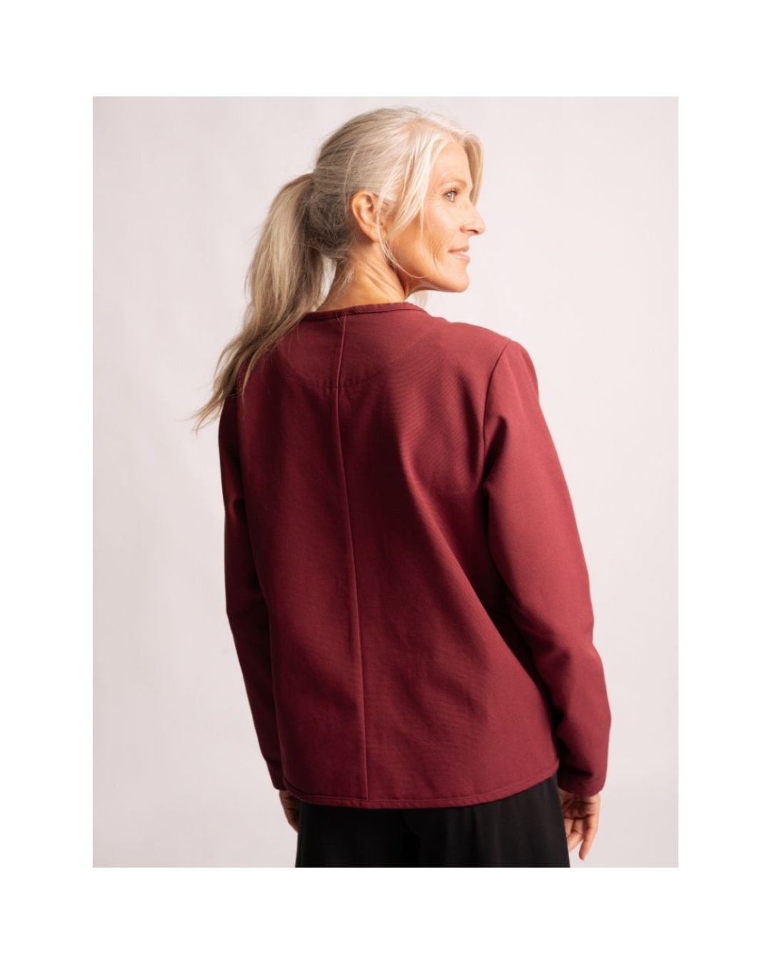 Im Inneren findest du einen goldfarbenen Print, der dem Kleidungsstück eine subtile Eleganz verleiht. Der sanfte Kontrast zwischen dem perlrosa Innenbeleg und dem tiefroten Stoff sorgt für eine ruhige, warme Farbwirkung.
