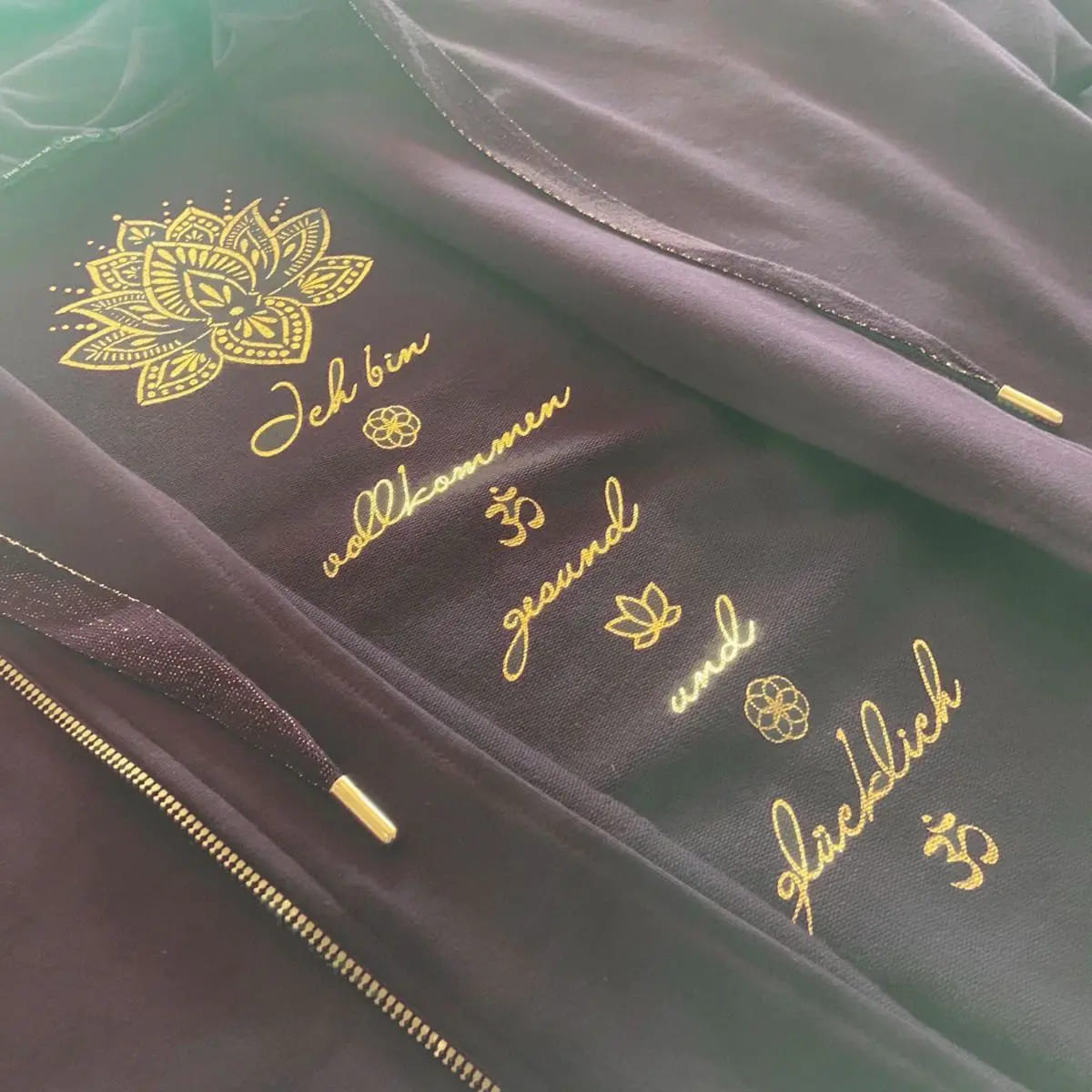 An der Hüfte befindet sich eine kleine goldene Lotusblume, die Reinheit, Treue und Kreativität symbolisiert. Im Innendruck der Jacke findest du die stärkende Affirmation: „Ich bin einzigartig – Ich bin dankbar – Ich bin mutig – Ich bin.“ Diese positiven Glaubenssätze sollen dich im Alltag unterstützen und dir helfen, eine wertschätzende Verbindung zu deiner Kleidung aufzubauen. Indem du dich bei jedem Tragen mit der Affirmation verbindest, machst du dir die Besonderheit des Kleidungsstücks bewusst und förderst ein tieferes Wohlgefühl.