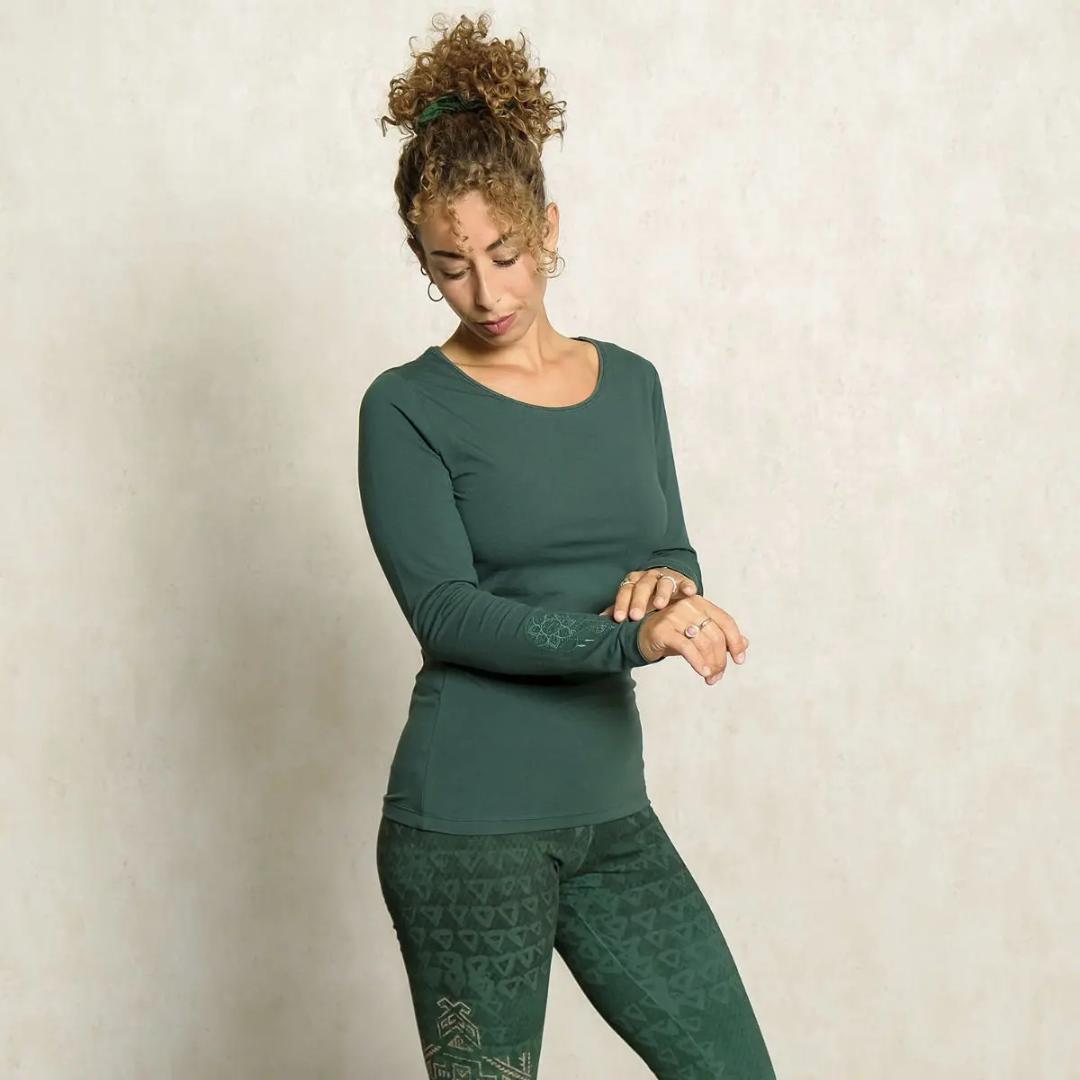 Entdecke das Chakra Motive Langarmshirt in Smaragd von Spirit of Om Das Chakra Motive Langarmshirt in leuchtendem Smaragd vereint Stil mit Wohlbefinden und ist ein Muss für jeden nachhaltig orientierten Kleiderschrank. Hergestellt aus einer Mischung aus Bambus-Viskose, Bio-Baumwolle und Elastan, bietet dieses Shirt nicht nur Komfort, sondern auch eine bewusste Wahl für umweltfreundliche Mode. Weich und umweltfreundlich: Eine Verbindung, die sich gut anfühlt