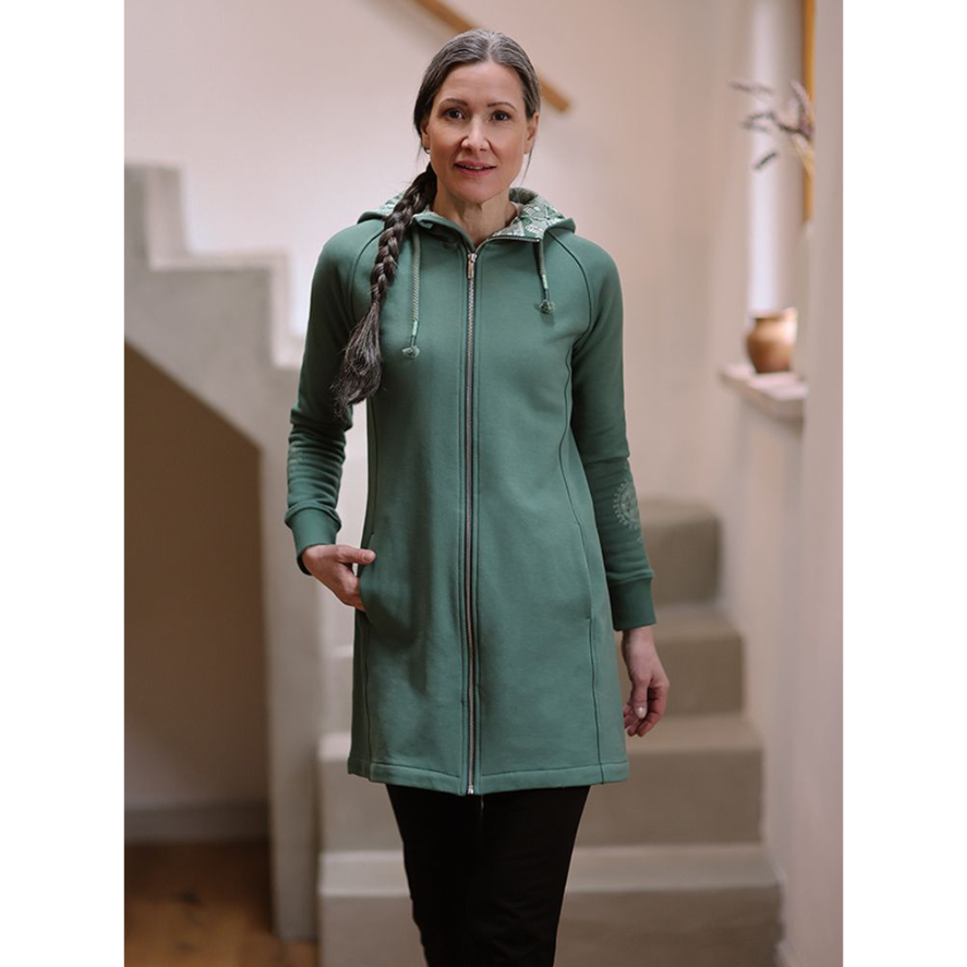 Der gerade, leicht taillierte Schnitt betont die Figur, während Raglanärmel für Bewegungsfreiheit sorgen. Die doppellagige Kapuze mit einem weichen Innenfutter aus Jerseystoff mit Alloverdruck setzt optische Akzente und schützt vor Wind und Wetter. Ein hochwertiger Metallreißverschluss und zwei nahtverdeckte Taschen runden das durchdachte Design ab.
