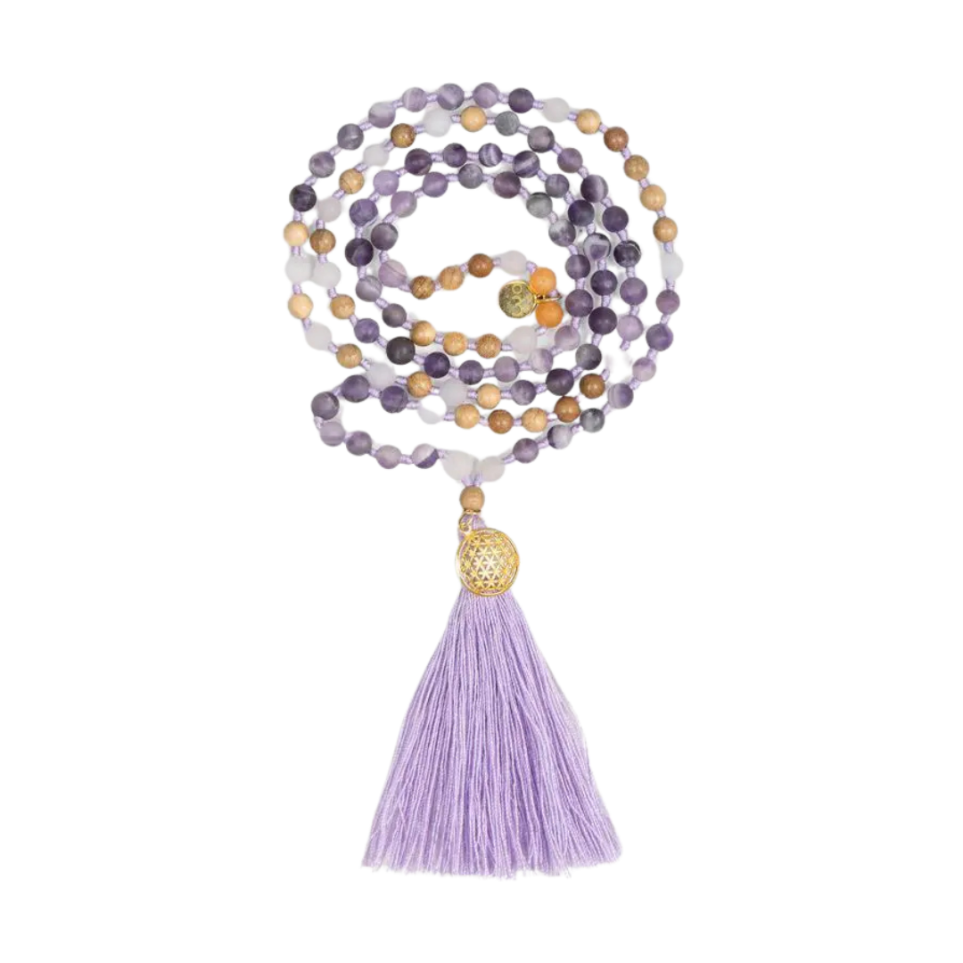 Der Amethyst, bekannt als Stein der Klarheit, bildet das Herzstück dieser Mala. Ergänzt wird er durch Schneequarz-Perlen, die für einen ausgleichenden Effekt sorgen. Abgerundet wird das Design durch Sandelholz-Perlen, die eine natürliche Wärme ausstrahlen und das Gesamtbild harmonisch vervollständigen. Die goldene "Blume des Lebens" an der Quaste symbolisiert Einheit und Verbundenheit, perfekt für Momente der inneren Einkehr.