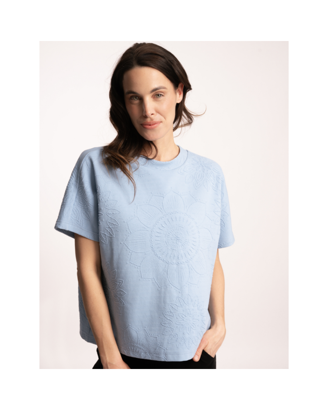 Das Besondere an diesem Shirt zeigt sich bereits im Material. Durch die Jacquard-Webung entsteht ein dezentes Hoch-Tief-Muster, das direkt in den Stoff eingearbeitet ist. Die eingewebten Mandala-Formen verleihen dem Design eine besondere Tiefe und eine ruhige, harmonische Ausstrahlung.