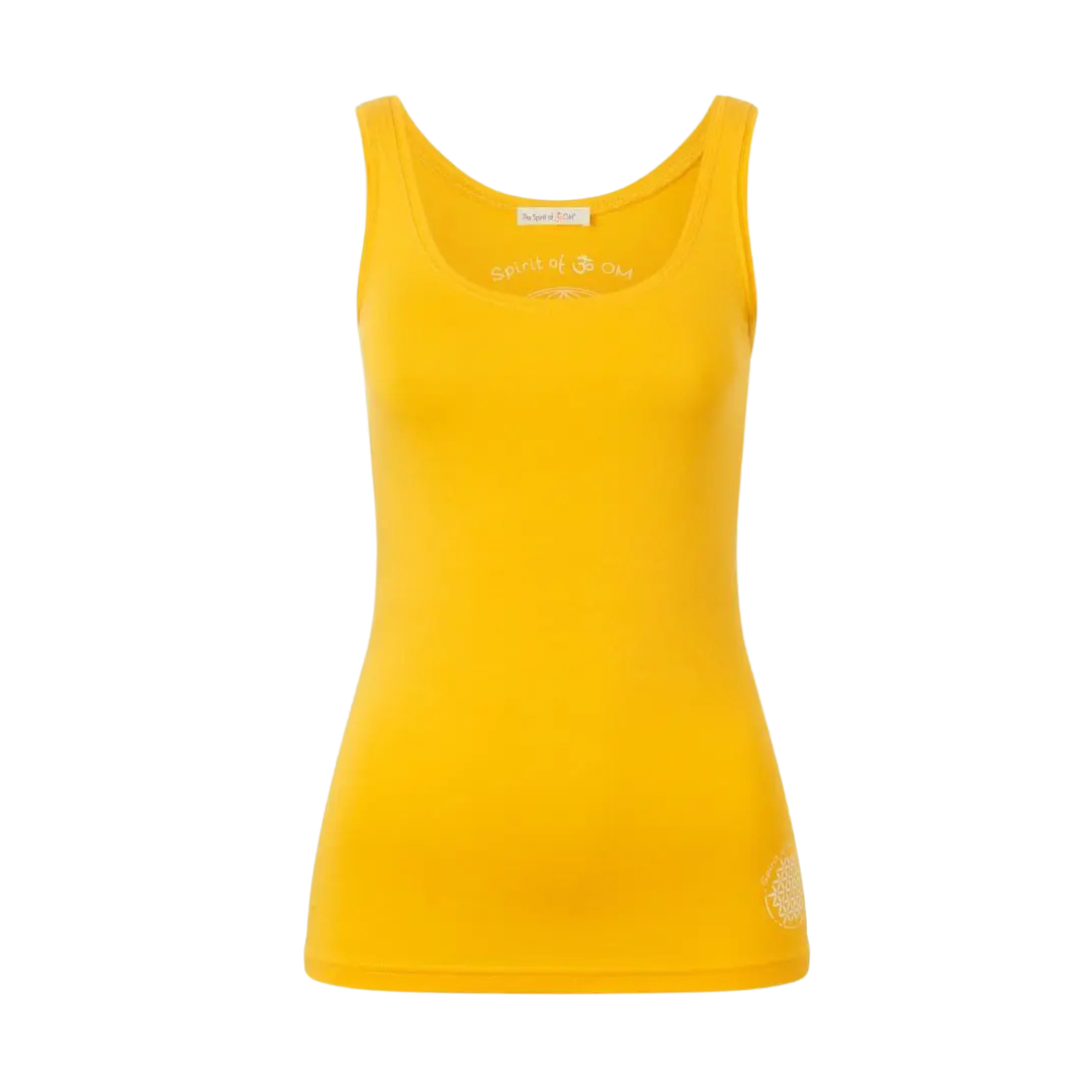 Ein zeitloser Klassiker in neuer Qualität: Dieses Top verbindet einen fein abgestimmten Materialmix mit spirituell inspirierten Details und setzt so neue Maßstäbe für Tragekomfort und Design. Das leuchtende Sonnenblumengelb sorgt für positive Akzente – ob als Einzelstück im Sommer oder als Unterzieher das ganze Jahr über.