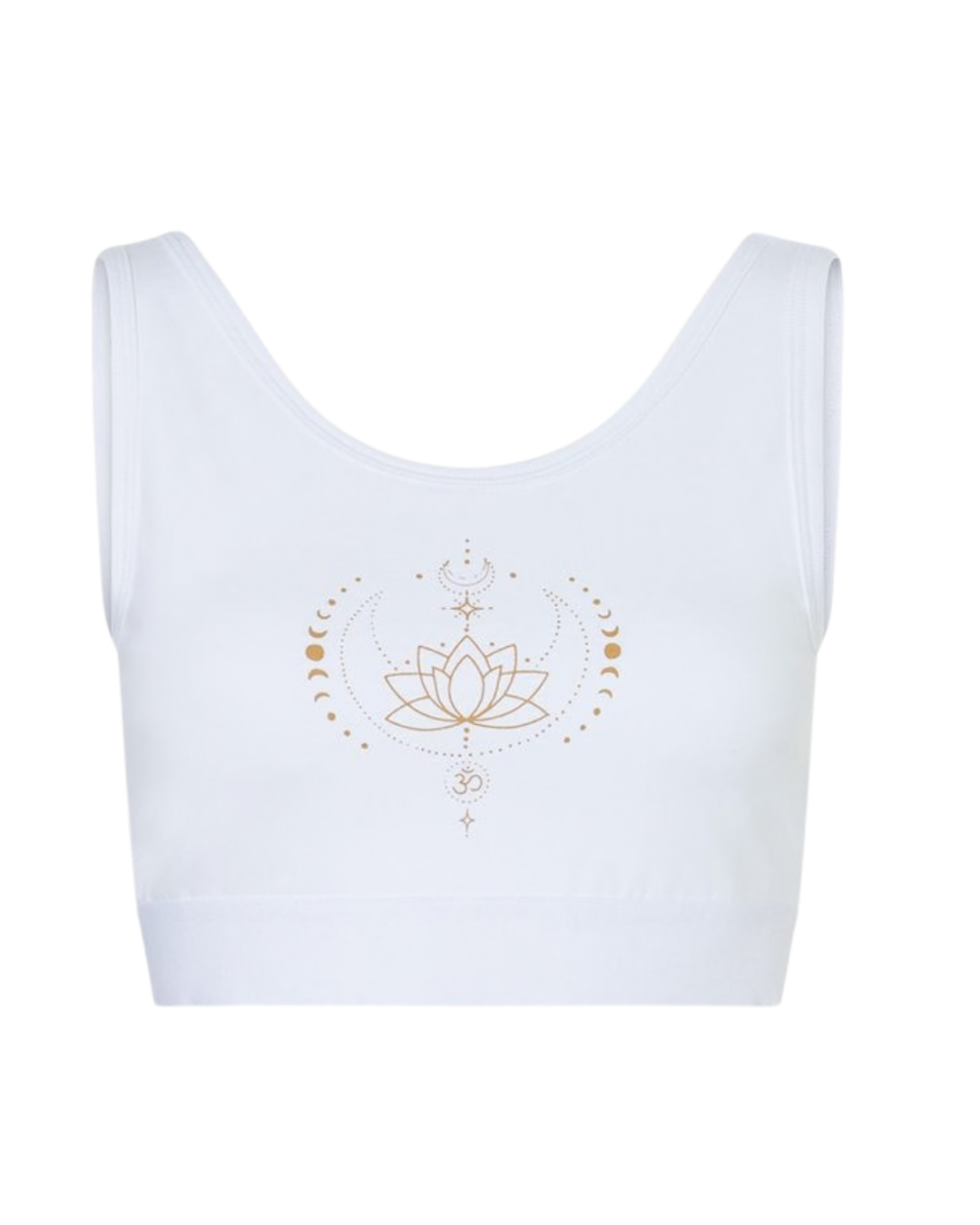Der dezente Goldprint „Eka Padma“ auf der Brust setzt einen eleganten Akzent, ohne den minimalistischen Look zu unterbrechen. Dadurch lässt sich der Bra vielseitig kombinieren – als Teil eines Yoga-Outfits, unter lockeren Shirts oder als bequemes Basic für den Alltag.