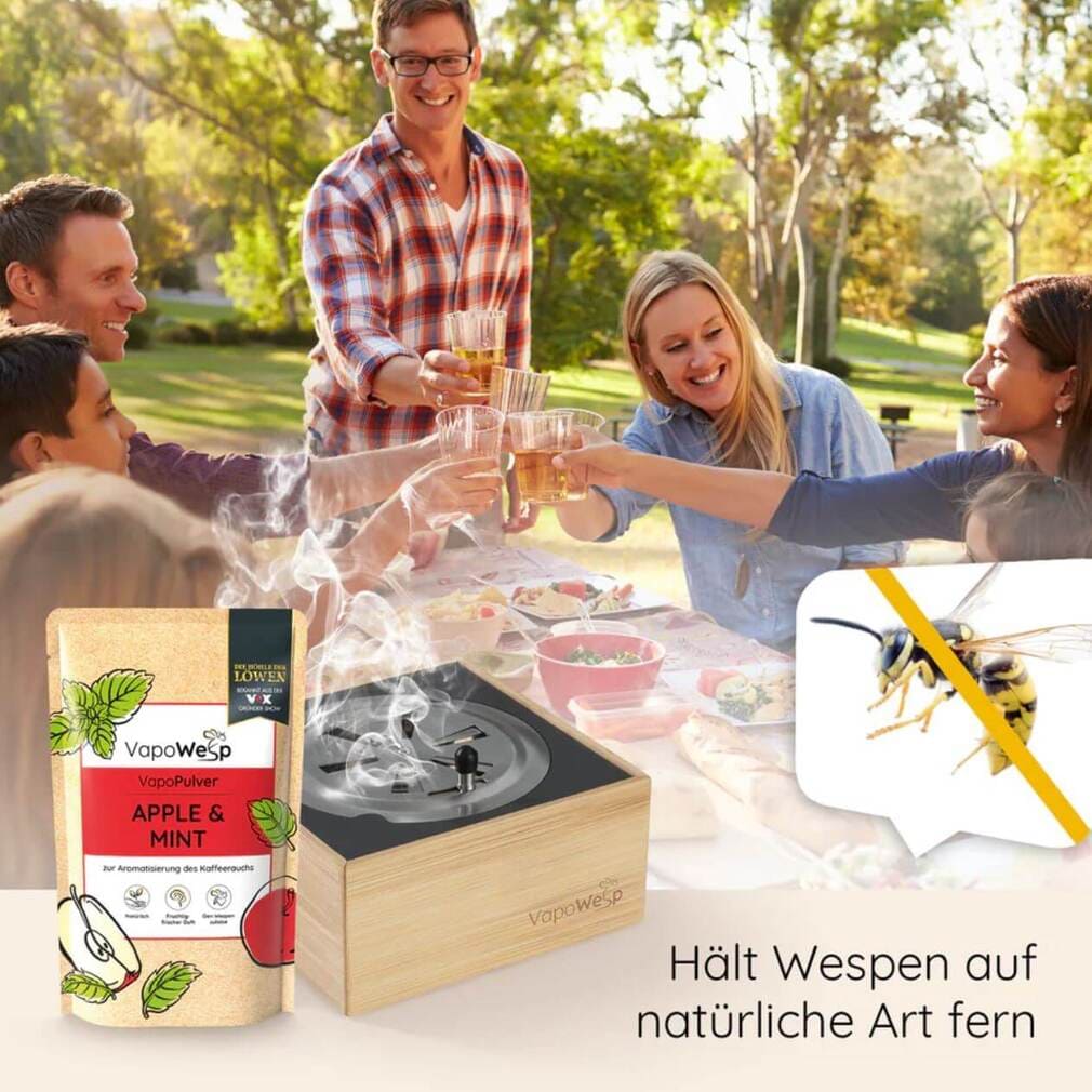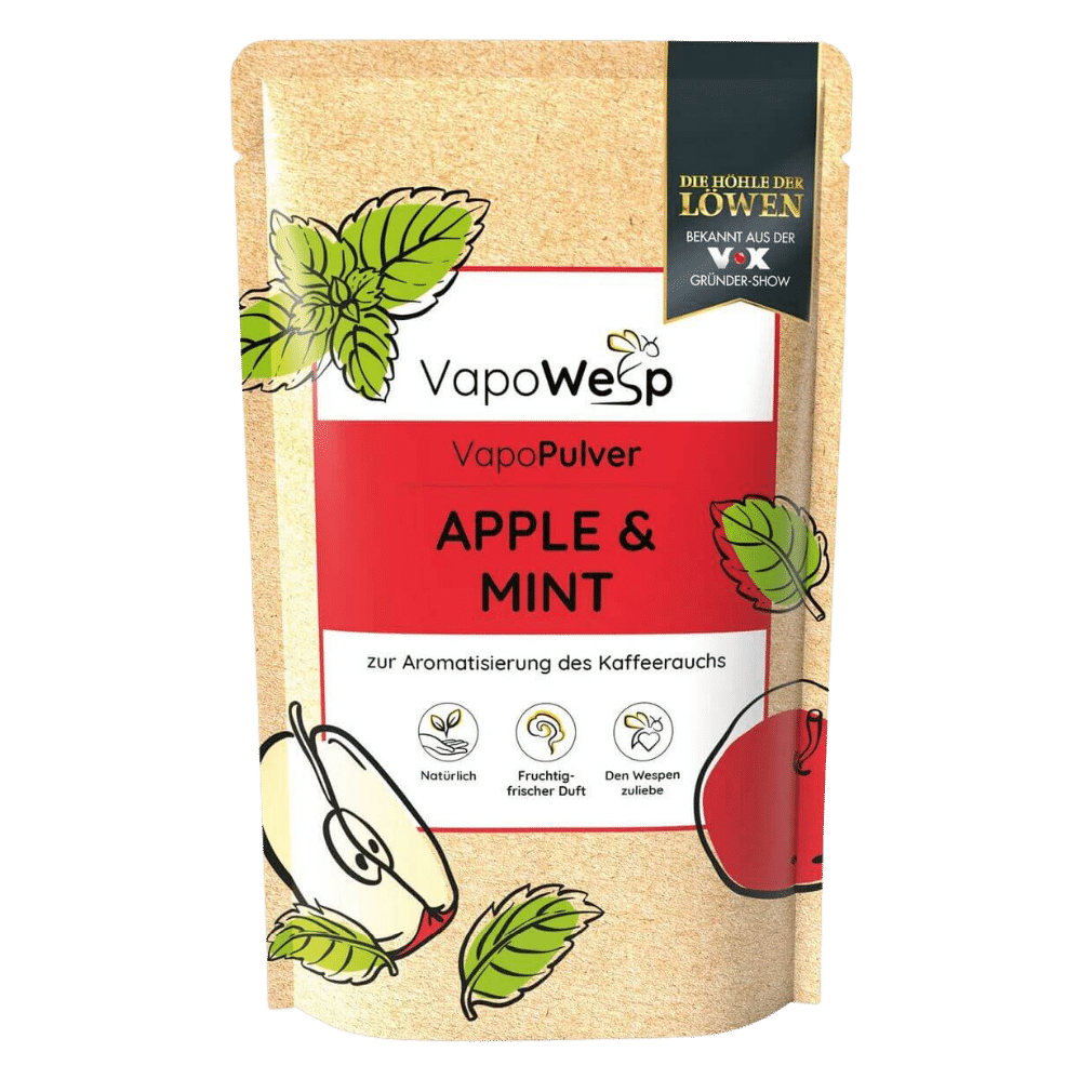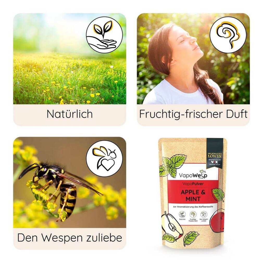 Durch die speziellen, natürlich duftenden VapoWesp Kräutermischungen wird das glimmende Kaffeepulver, welches normalerweise nach einiger Zeit unangenehm riecht, angenehm aromatisiert. So kannst du die Zeit im Freien entspannt genießen - mit zartem Räucher-Apfel-Minzerduft in der Nase!
